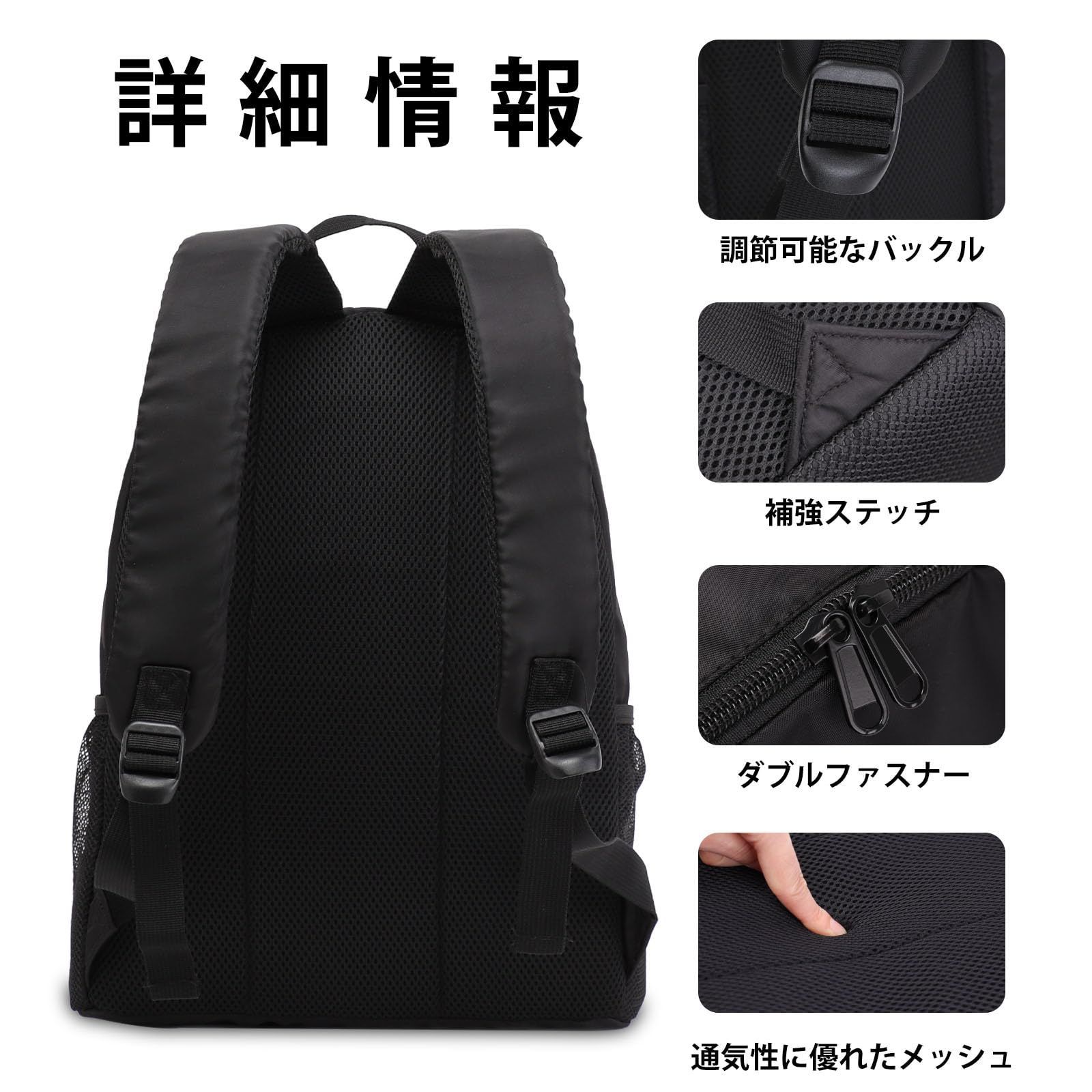 【高品質】リュックサックは、耐久性に優れたポリエステル素材を使用しています。防水性能も備えているため、水滴の侵入を防ぐことができます。また、リュックの裏側とショルダーストラップは通気性に優れたメッシュ素材で作られています。長時間使用しても背中を乾燥した状態に保つことができます。