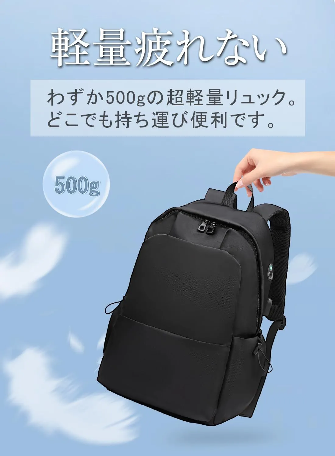 【使い勝手抜群・軽量】わずか500gで持ち運び便利です。軽いなのに十分な収納力があり、2層構造で15.6インチPCやタブレットなどはPC専門ポケットへ、書類・A4ファイル・衣類などはメインポケットへ、手帳・ペン・財布などの小物はフロント側のメインポケットへ、折り畳み式傘・水筒はサイドポケットへ、フロント・トップには小物ポケットが付き、使用頻度の高い小物をすぐに取りだせるのにとても便利です。通学・通勤・小旅行や短期出張に適した人気リュックです