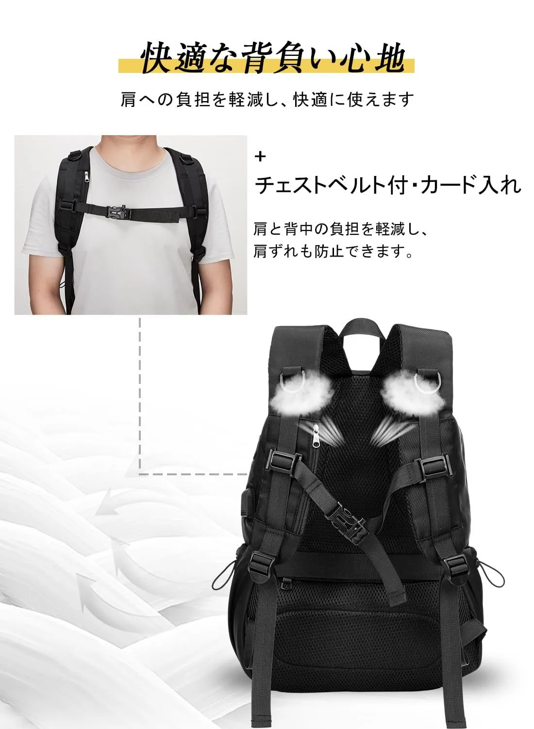 【通気性抜群】ショルダーベルト裏面は通気性に優れたメッシュクッションで仕上げ、ムレや摩擦を軽減。長時間着用するとき軽くて快適な背負い心地。さらに、チェストベルトも付くので、肩への負担を大幅に軽減して肩ずれを防止してくれます。長時間のご使用でも肩も痛くなりにくいのがポイントです