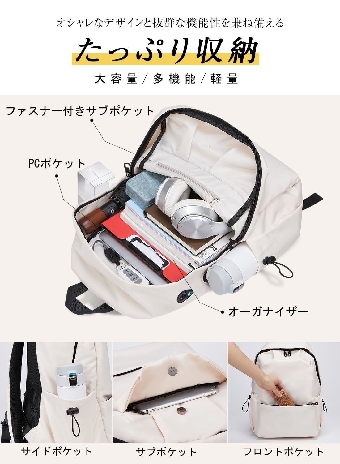 【使い勝手抜群・軽量】わずか500gで持ち運び便利です。軽いなのに十分な収納力があり、2層構造で15.6インチPCやタブレットなどはPC専門ポケットへ、書類・A4ファイル・衣類などはメインポケットへ、手帳・ペン・財布などの小物はフロント側のメインポケットへ、折り畳み式傘・水筒はサイドポケットへ、フロント・トップには小物ポケットが付き、使用頻度の高い小物をすぐに取りだせるのにとても便利です。通学・通勤・小旅行や短期出張に適した人気リュックです