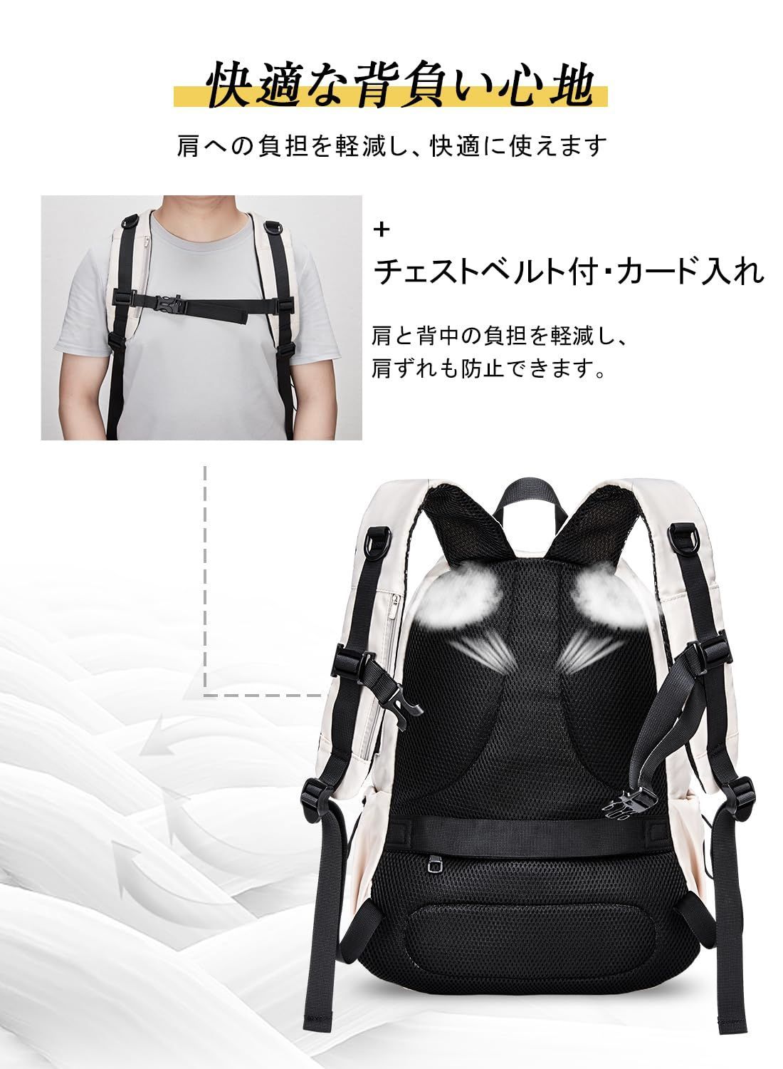 【通気性抜群】ショルダーベルト裏面は通気性に優れたメッシュクッションで仕上げ、ムレや摩擦を軽減。長時間着用するとき軽くて快適な背負い心地。さらに、チェストベルトも付くので、肩への負担を大幅に軽減して肩ずれを防止してくれます。長時間のご使用でも肩も痛くなりにくいのがポイントです