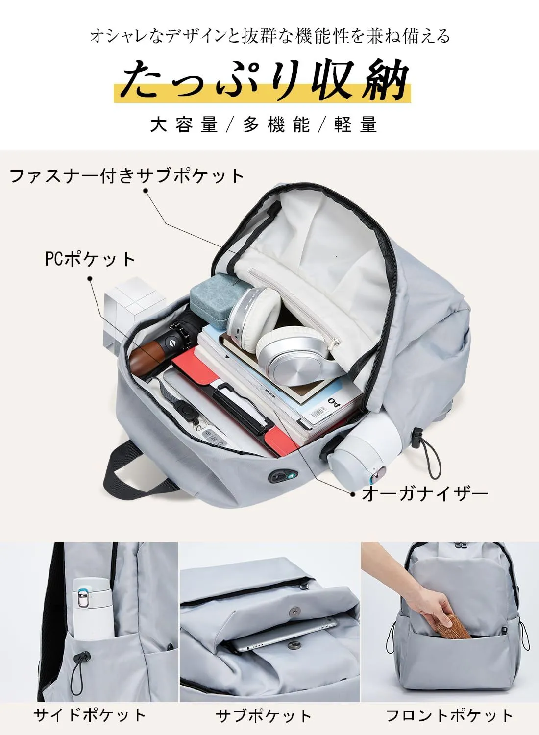 【見た目より大容量・軽量】わずか500gで持ち運び便利です。軽いなのに十分な収納力があり、2層構造で15.6インチPCやタブレットなどはPC専門ポケットへ、書類・A4ファイル・衣類などはメインポケットへ、手帳・ペン・財布などの小物はフロント側のメインポケットへ、折り畳み式傘・水筒はサイドポケットへ、フロント・トップには小物ポケットが付き、使用頻度の高い小物をすぐに取りだせるのにとても便利です。通学・通勤・小旅行や短期出張に適した人気リュックです