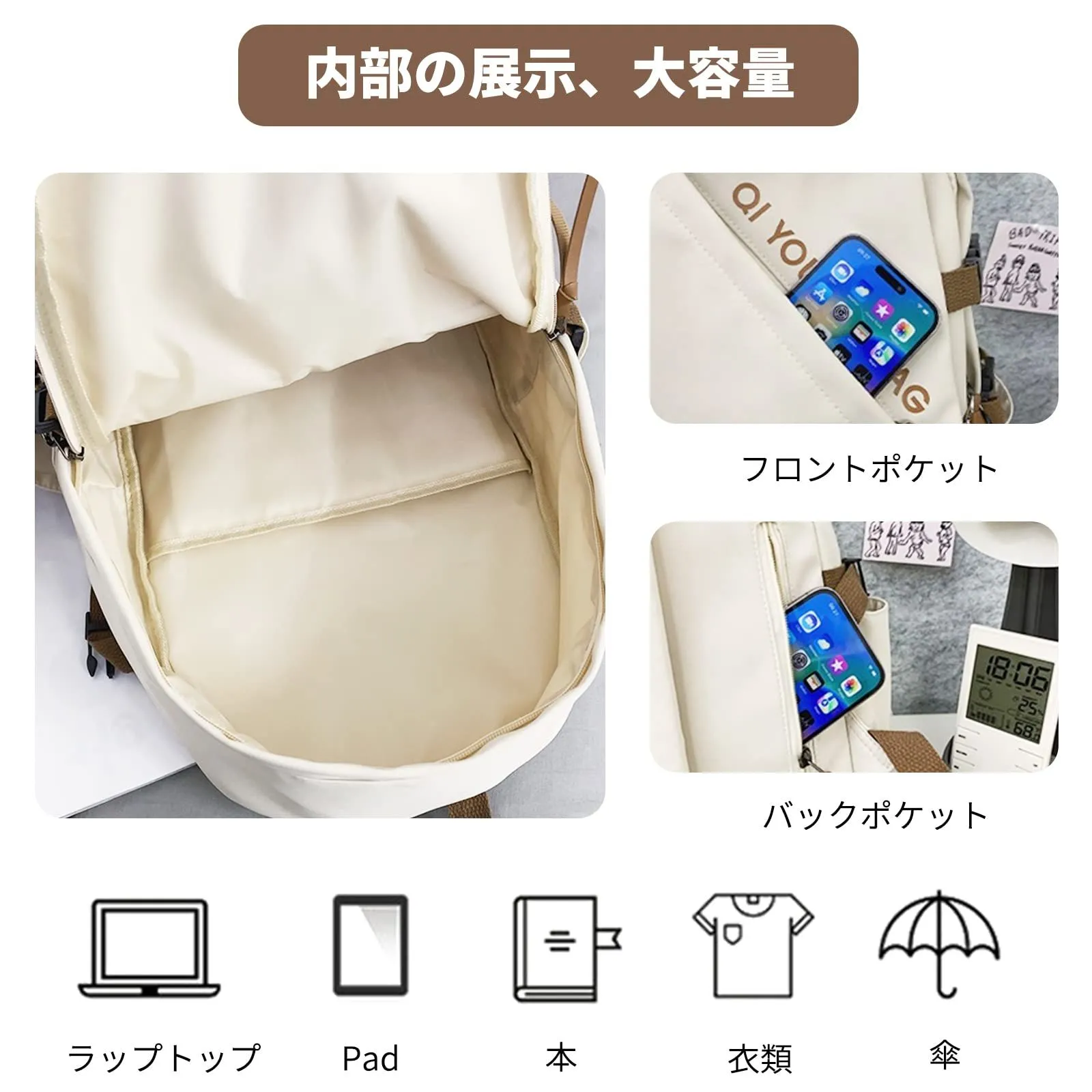 【収納力抜群】お出かけに必要な物がたっぷり入ってとっても便利。15.6インチまでのノートパソコン、A4サイズの本、折り畳み傘、携帯、タブレット、鍵、お財布、カード、眼鏡など、全て収納可能。