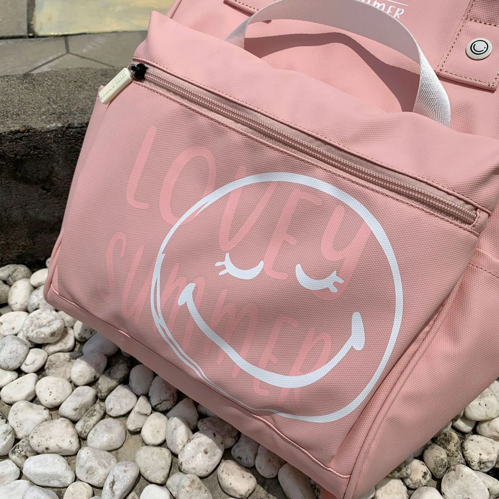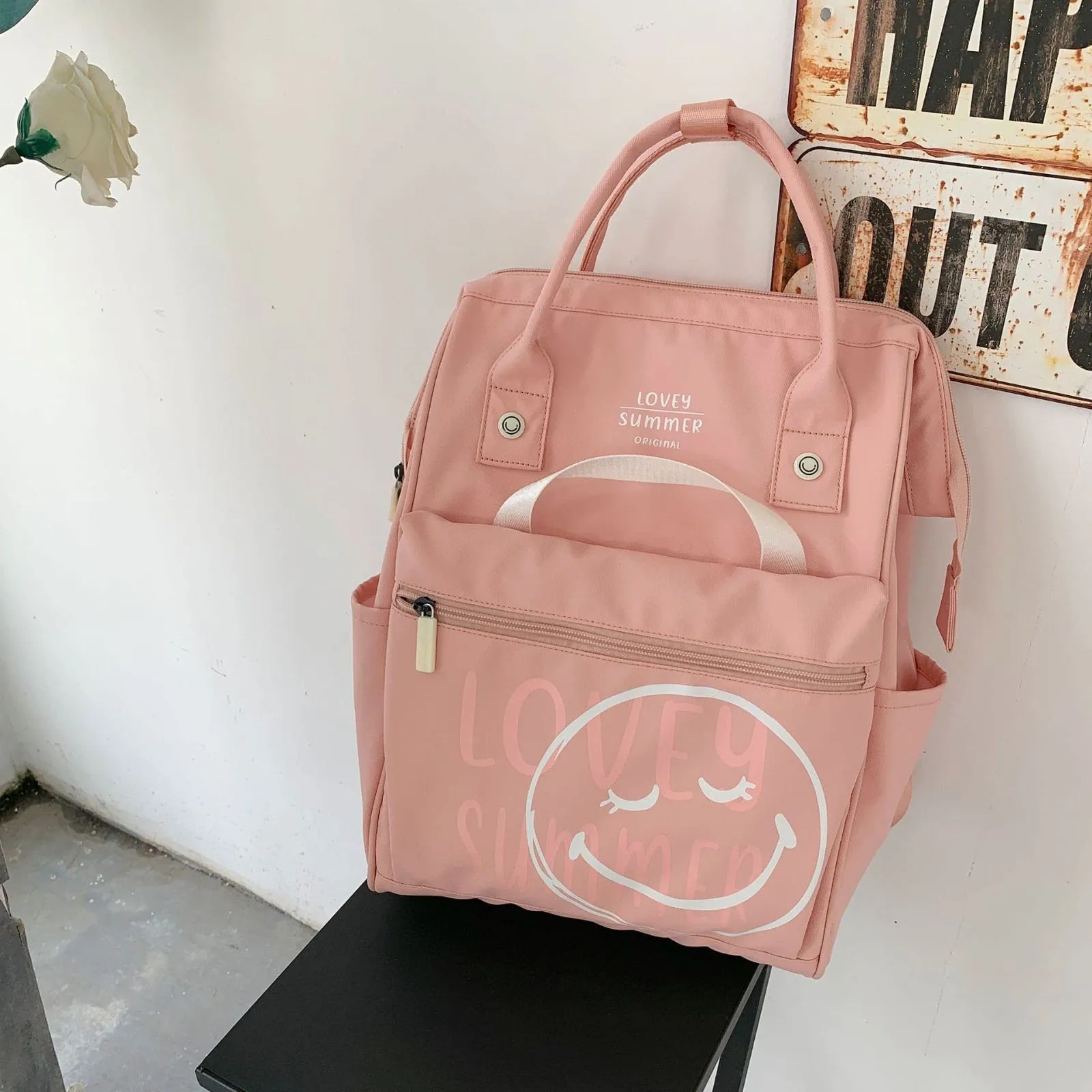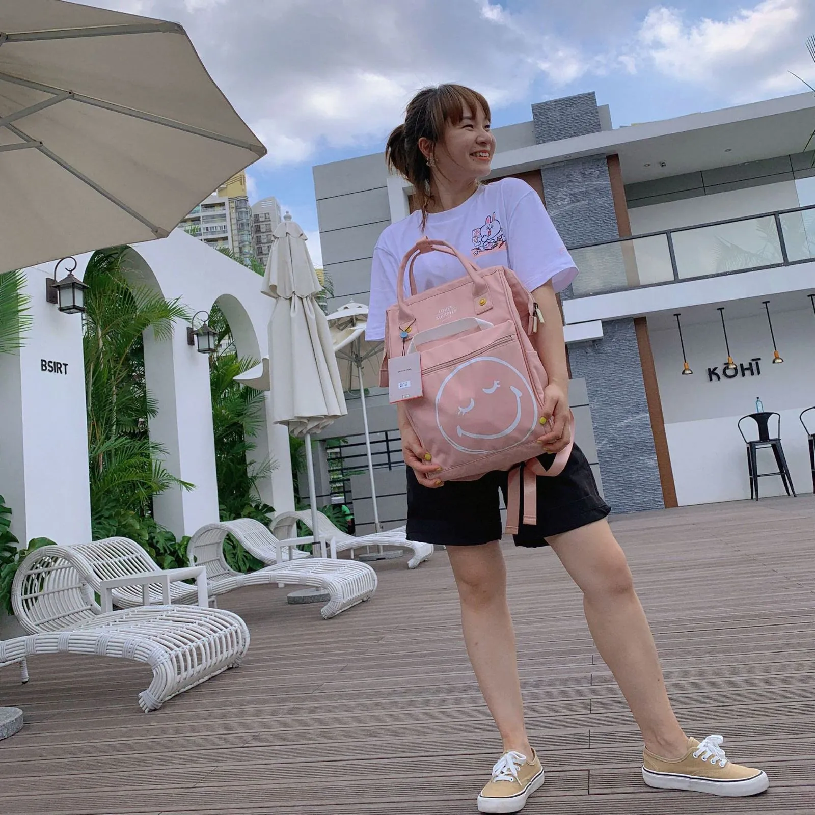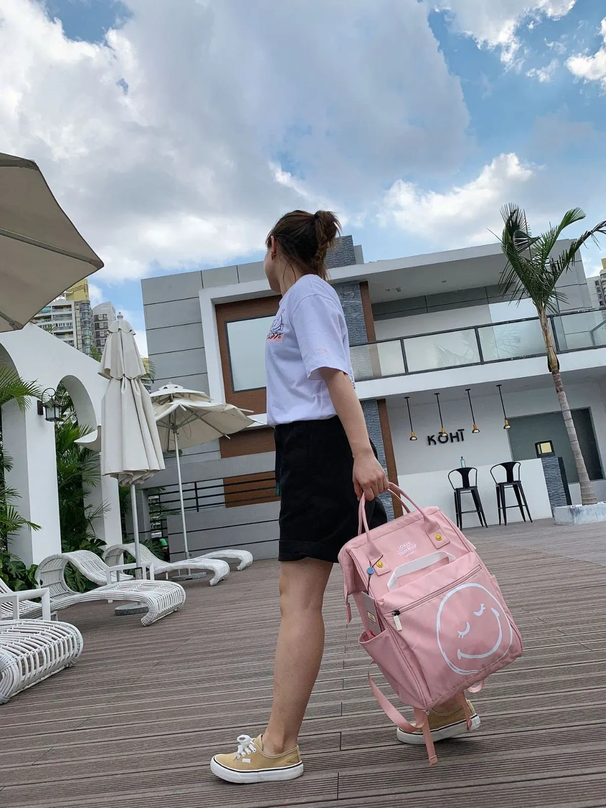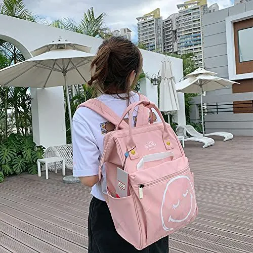 【デザイン】insファション笑顔イメージデザインが施され、高級な防水ナイロン生地製作です。超軽量デザイン、肩ひもには適度な厚みがあり、クッション性がいいので負担を感じません。 リュックバックパックの内部は複数の多機能ポケットがあり、収納力抜群です、裏面隠しのファスナーポケット安全性高いです。 楽に背負うことができます。