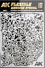ランダムな模様の穴の空いたアセテート素材のステンシルです。自然な模様や生物的なパターンをつけるのに便利です。エアブラシステンシルは、柔軟性があってモデルの形状に対応しやすく、表面を傷つけません。また清掃も簡単で、どんなスケールにも使用できます。使い方は、ステンシルを任意の位置に当てて、希釈した塗料を薄くエアブラシします。この際、一回で仕上げようとせず、希釈した塗料を薄く何回かエアブラシして、塗料が溜まったり流れたりしないようにしてください。またベース色に近い色から始めると違和感が小さくなります。