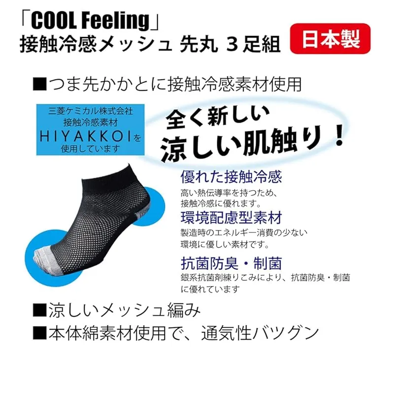指先・カカトに接触冷感素材を使用して涼しい肌触り。
