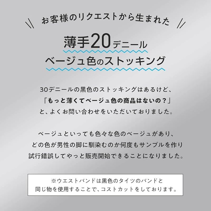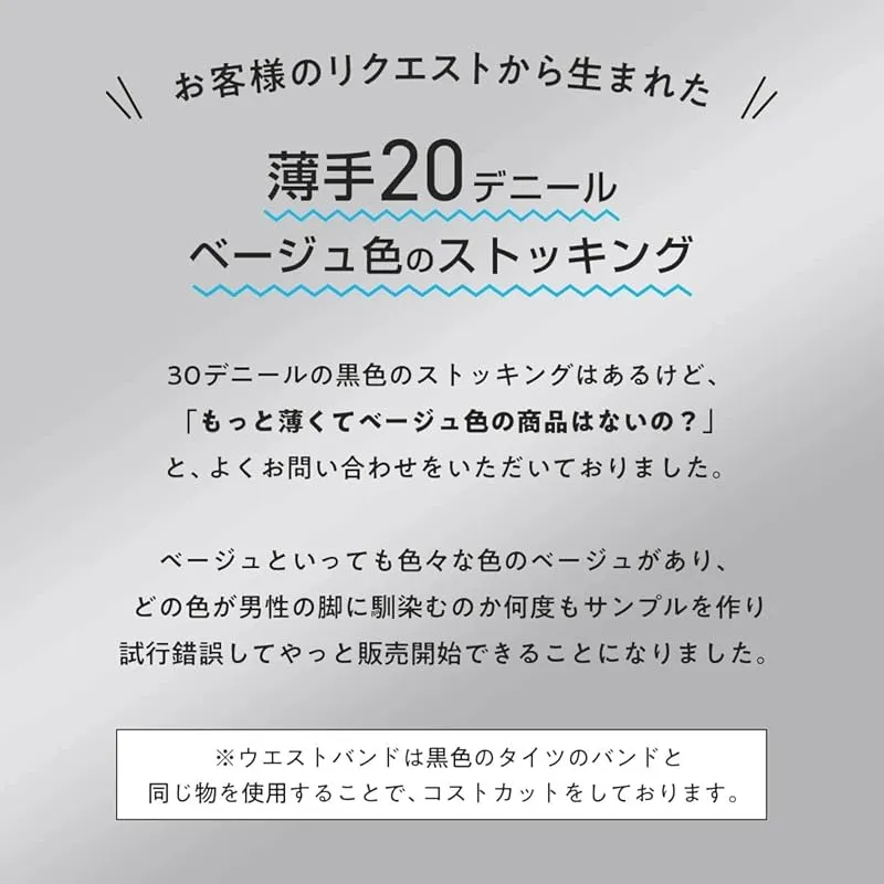 【ベージュ】ストッキング。沢山のリクエストありがとうございました!限りなく薄く、肌の色に馴染むベージュカラーのストッキングです。ストッキング作りで得たノウハウを元に男性でも美しく履いていただけます。春先など肌寒い季節の防寒対策としての重ね履きなど、ぜひ一度お試しください。※ウエストバンドは黒色のタイツのバンドと同じ物を使用することで、コストカットをしております。