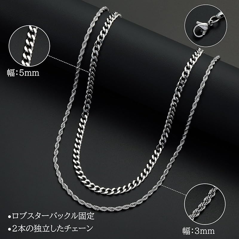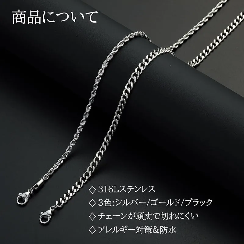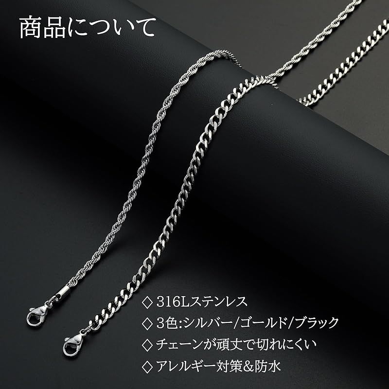 【豊富なバリエーション】メンズネックレスは、40/45/50/55cmの4つのチェーン長、ゴールド、シルバー、ブラックの3色から選択できて、多様なファッションニーズに対応しています。フィガロチェーン:幅5mm、ロープチェーン:幅3mmです。