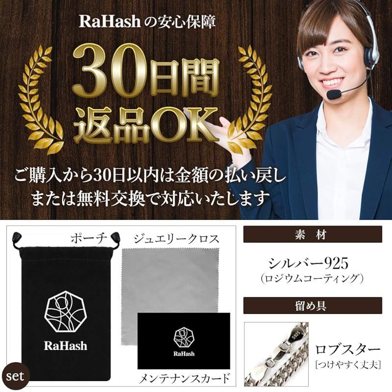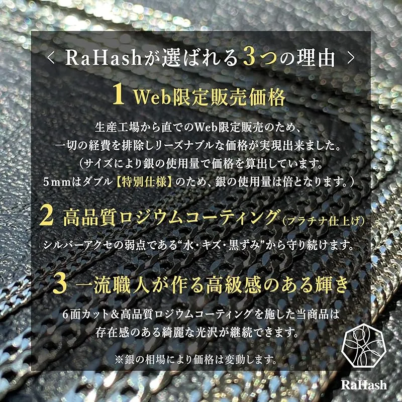 【商品仕様】○サイズ:《幅 2mm・長さ 50cm》○素材:シルバー925(ロジウムコーティング) ○セット内容:ブランドロゴ入り巾着袋・ジュエリークロス・メンテナンスカード ○:検品を徹底し品質向上に努めていますが、不良品などございましたらご購入から30日以内の場合、金額の払い戻し、または無料交換で対応させていただきます ○ブランド:RaHash (商標登録第6221209号) ※サイズにより銀の使用量で価格を算出しています。5mmはダブル「特別仕様」の為、銀の使用量は倍となります。