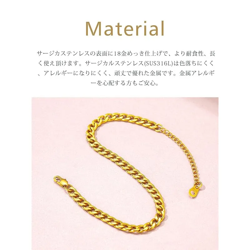 サージカルステンレス製:メンズアンクレット全体にサージカルステンレスを採用します。サージカルステンレスは色落ちにくく、アレルギーになりにくく、頑丈で優れた金属です。金属アレルギーを心配する方もご安心。ゴールドアンクレットはステンレスの表面に18金めっき仕上げで、より耐食性、長く使え頂けます。