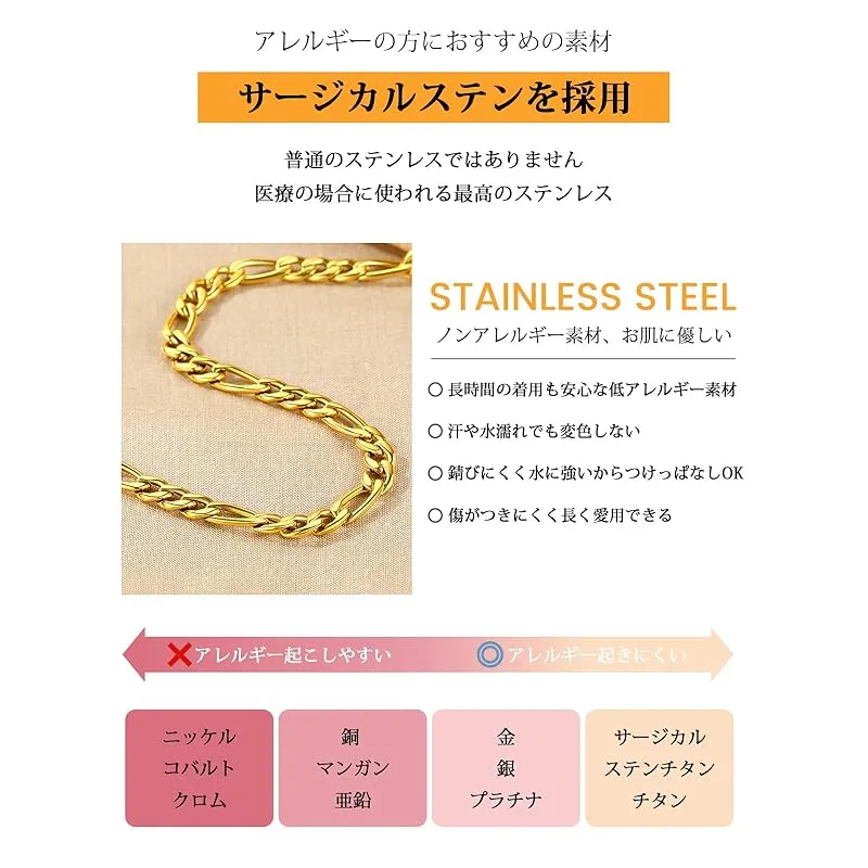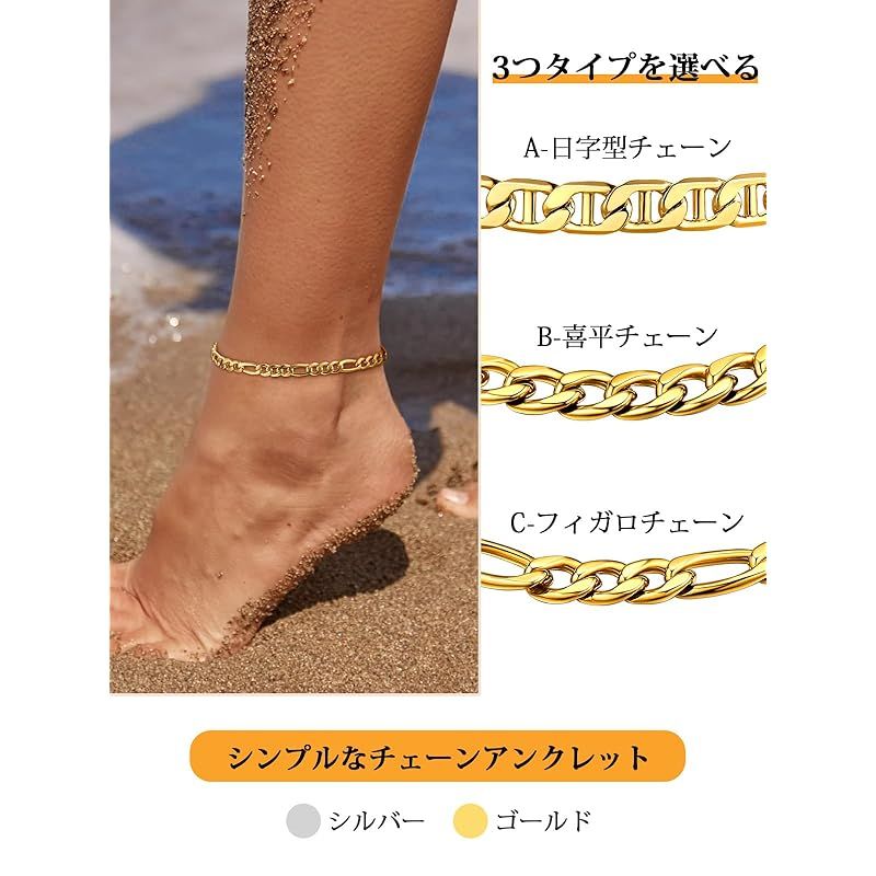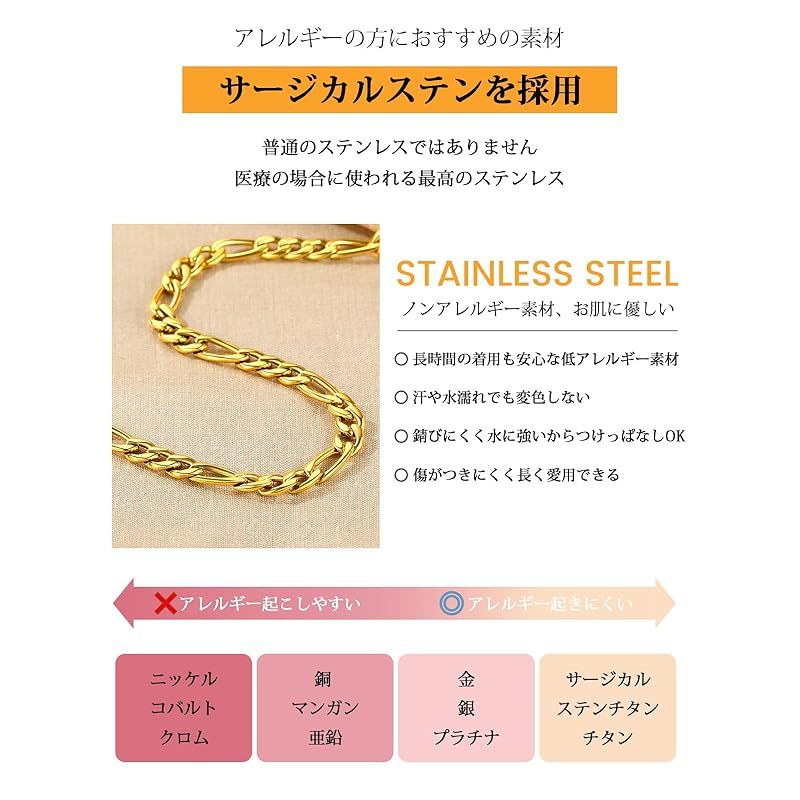 水にも強く、金属アレルギーの方でも比較的安心して使えるお肌に優しいサージカルステンレス製のアンクレットです。 大人っぽく、コーデのアクセントにぴったりな足元からオシャレを楽しめるアイテムです