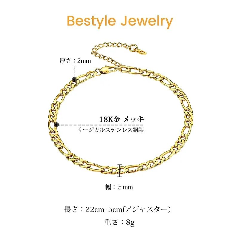 【新品】 Bestyle ゴールド アンクレット レディース メンズ ステンレス 喜平 チェーン アンクレット 22cm(5cmアジャスター付き) 男女兼用 シンプル