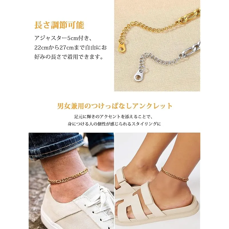 【定番でシンプルなデザイン】年代を問わず男女ともに着用していただけるシンプルなアンクレットです。トレンドに左右される事なく幅広いスタイルのファッションに合うので一つあると困らないアイテムです。