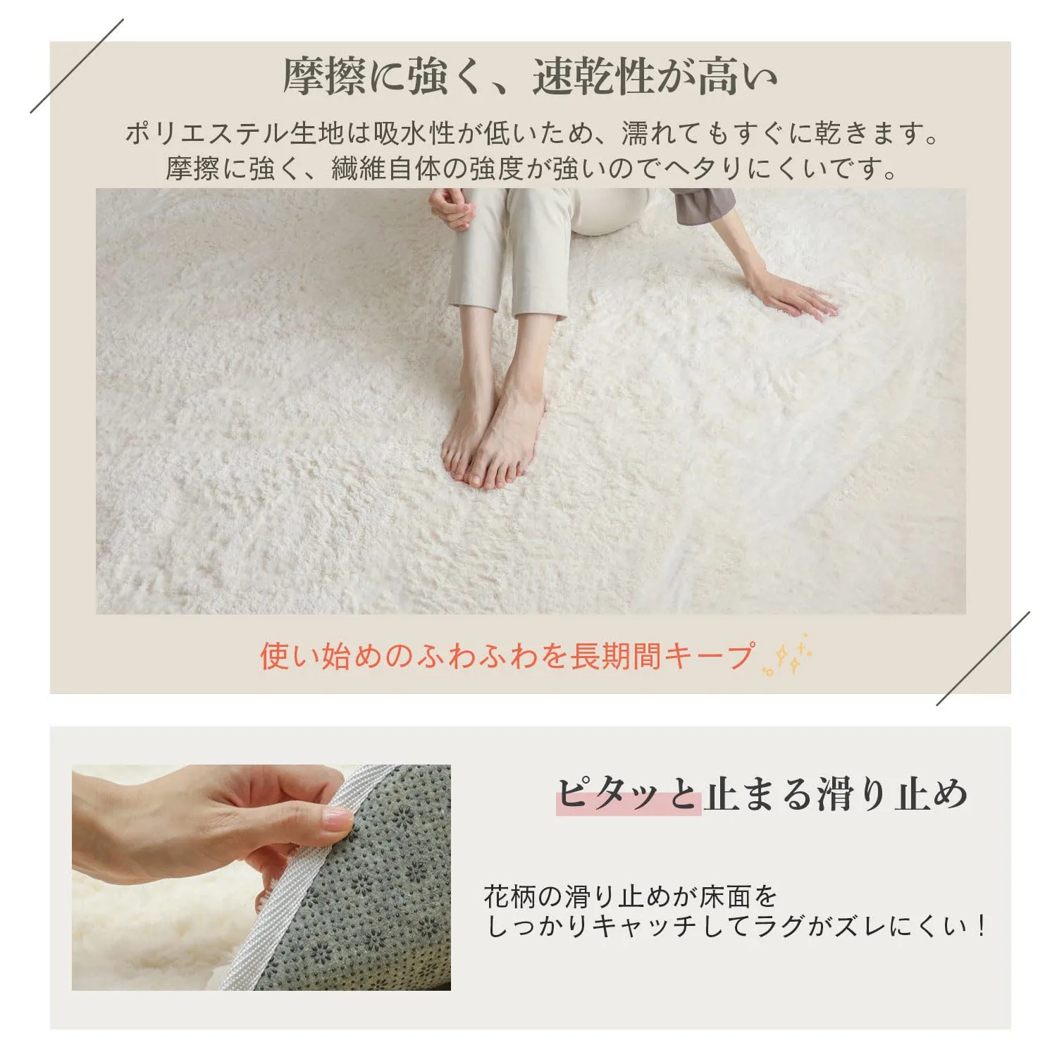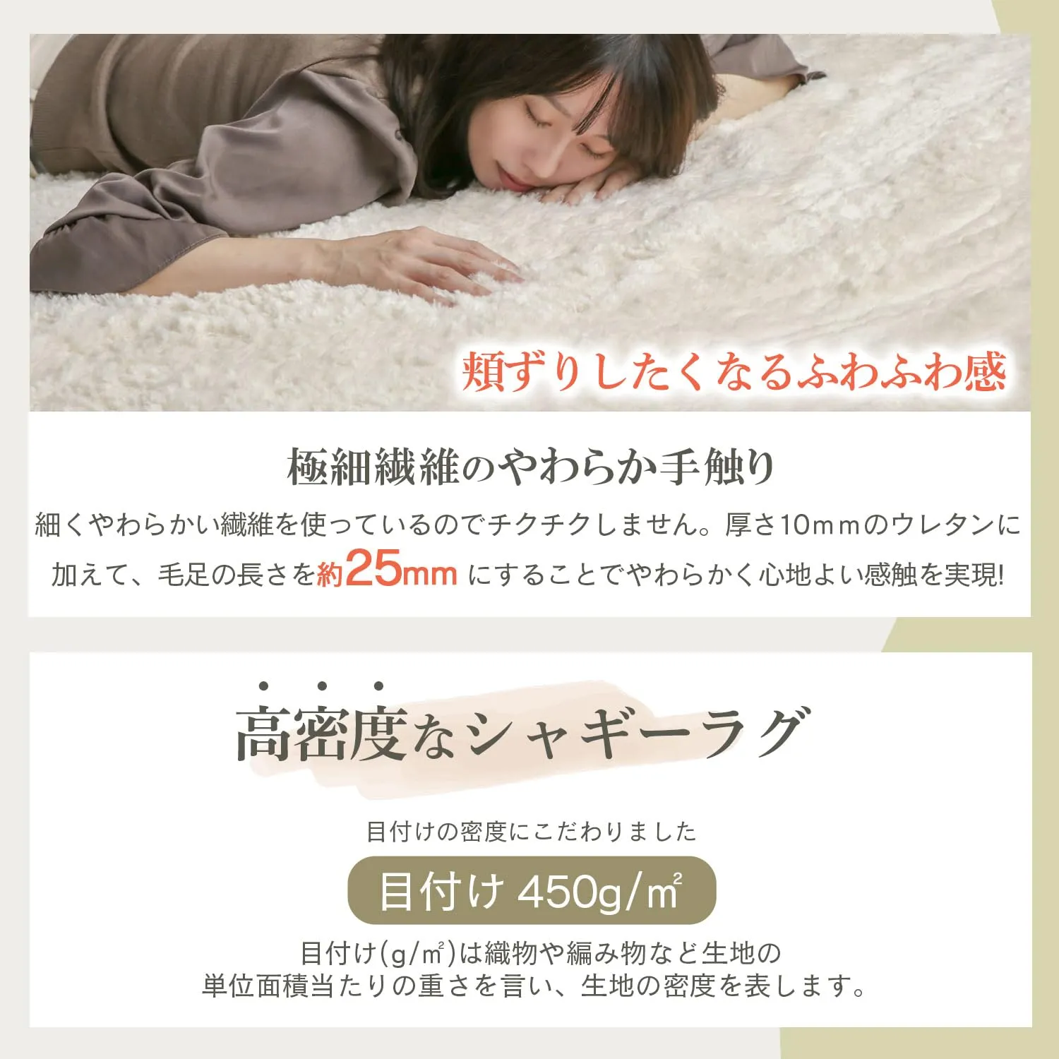 【商品の特徴】ふわふわシャギー、オシャレなカラー、ラビットファーのような手触り、お手入れ簡単、毛が抜けにくい、滑り止め付き、ホットカーペット対応、床暖房対応、オールシーズン、手洗い可能