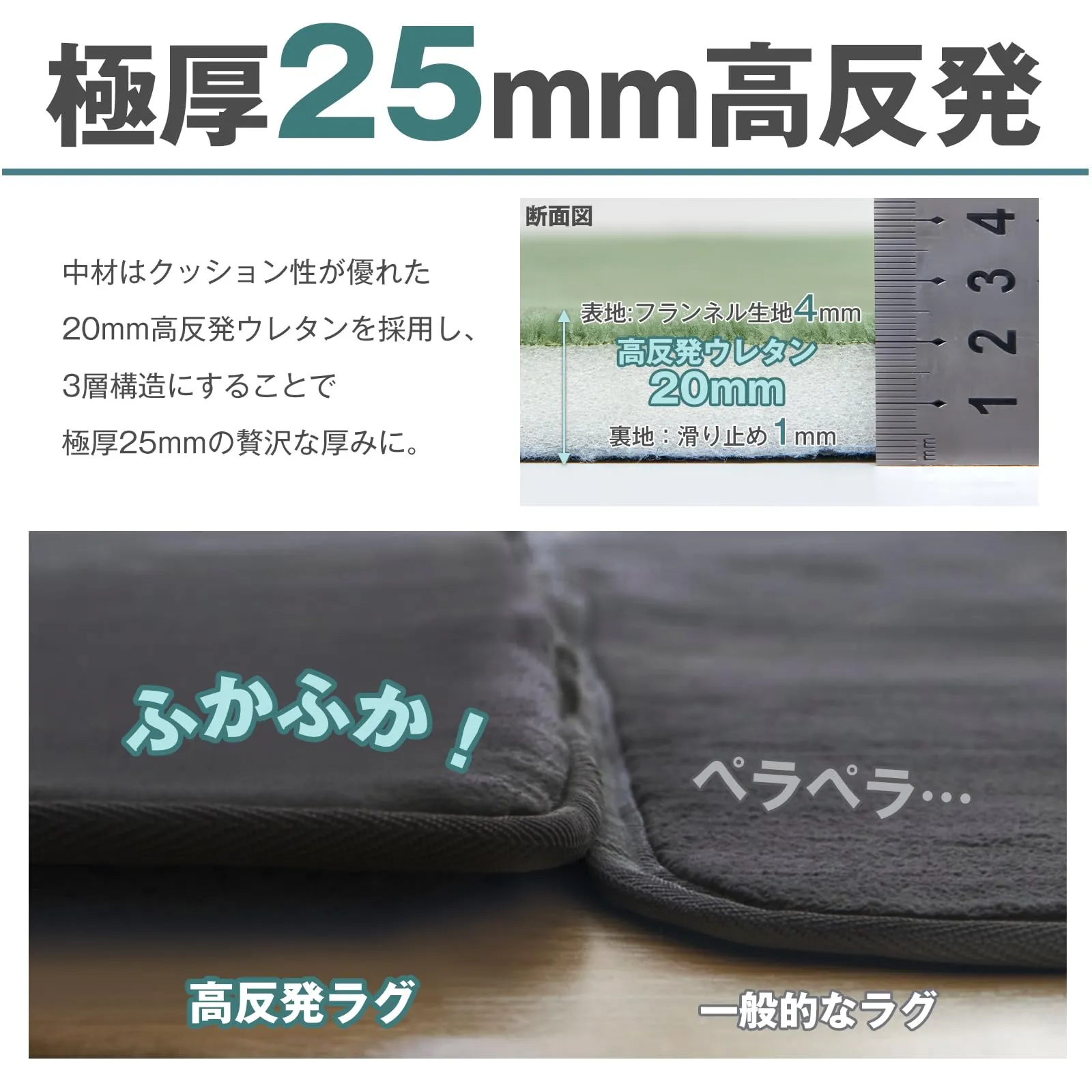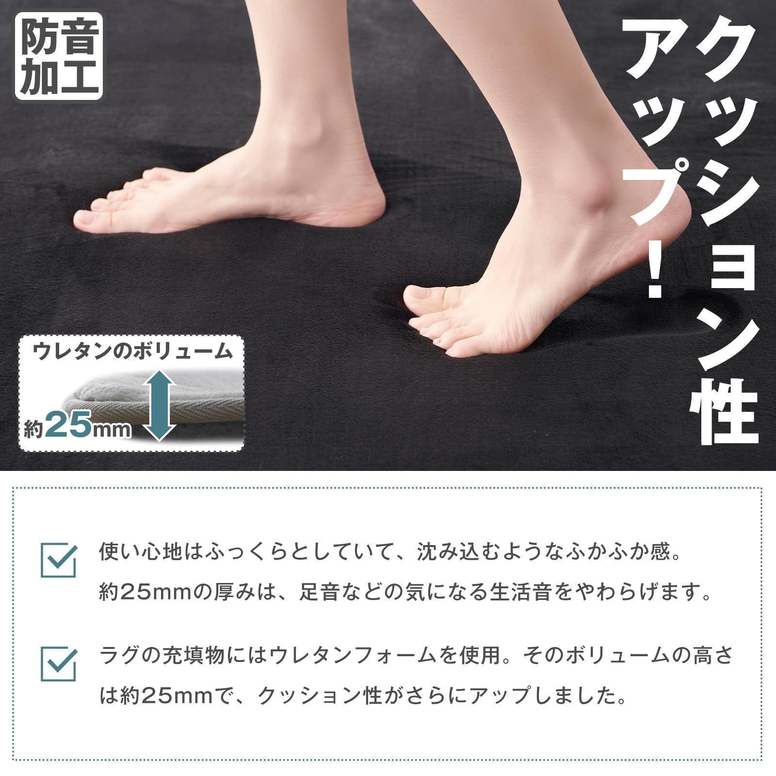 【極厚25mm高反発カーペット】クッション性と復原性を兼ね揃える高反発ウレタンを贅沢に使っているので、踏み心地がすごくふんわり、底付き感を感じず、暮らしの中で起こるさまざまな衝撃音もしっかり吸收でき、毎日を自然に過ごせる環境づくりにお手伝いします。