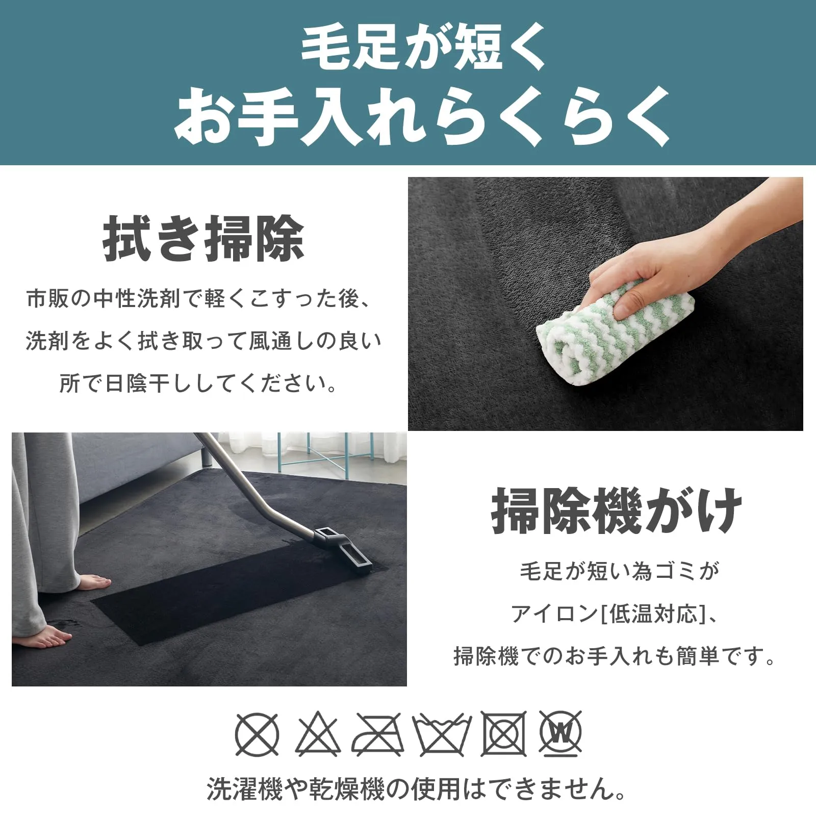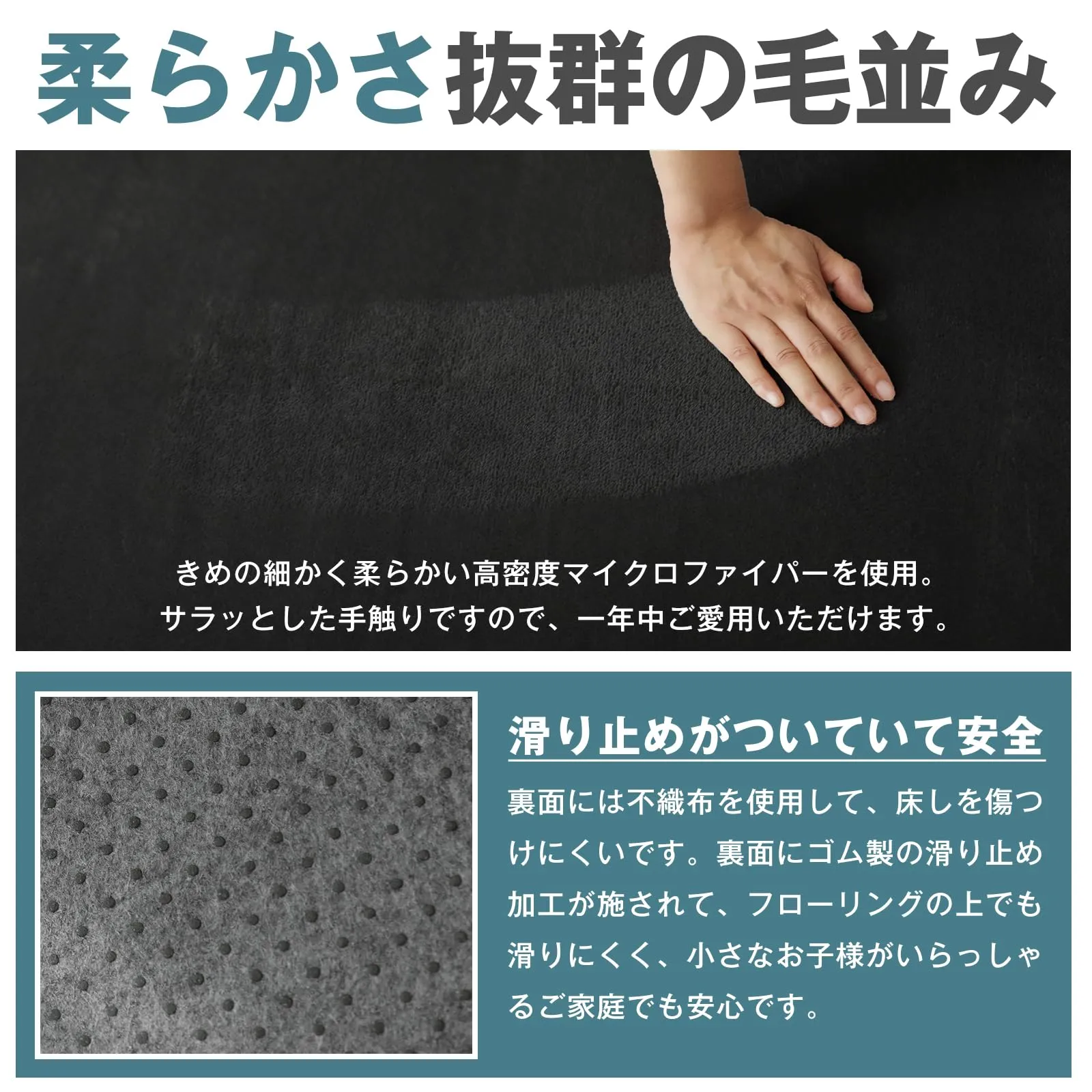 【自然の消臭効果・滑り止め】お子様やペットがいるご家庭にも安心するために、本商品は抗菌防臭・防ダニ加工を施した上で、ウレタンには特殊製法によってつくられた竹炭を加えて、天然の消臭機能で、気になるニオイを元からブロックします。ラグのズレを解消するのが、裏面に複数あるドットの滑り止め!床面をしっかりキャッチして、抜群の滑りにくさを実現しました。