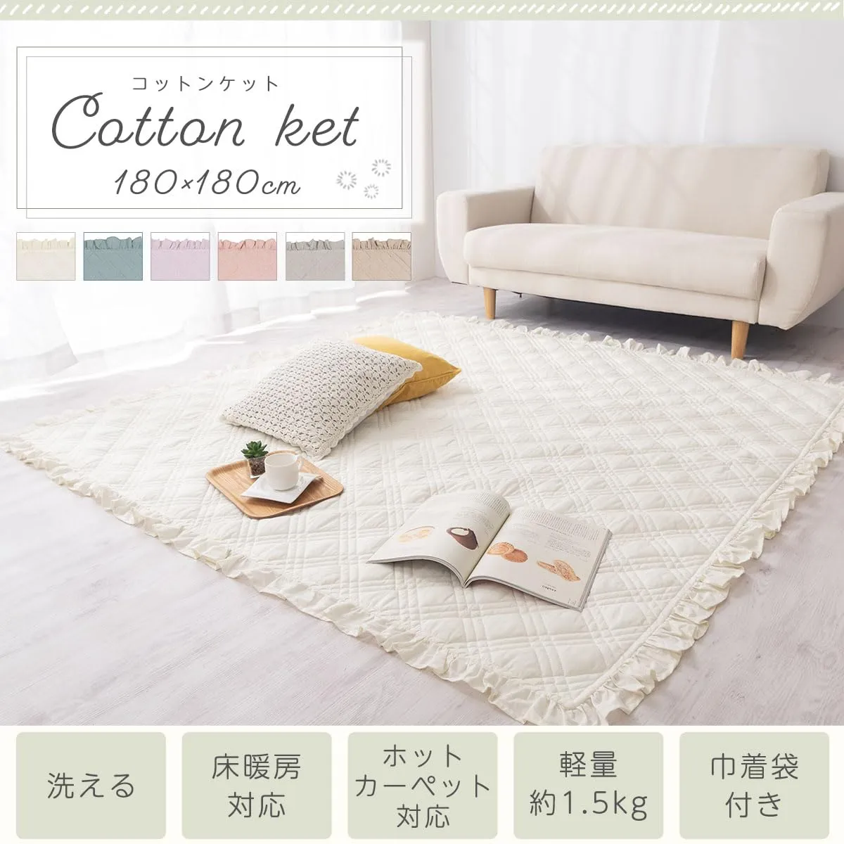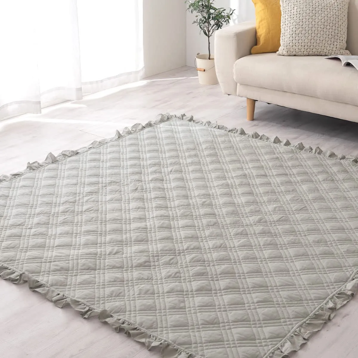 ぼん家具 ラグ キルト 洗える 正方形 180 ラグマット コットン ソファカバー マルチカバー 綿 キルトケット フリル ライトグレー