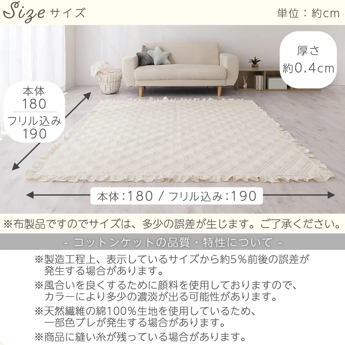 材質 表面:綿100% 裏面:ポリエステル100%(ピーチスキン加工) 中綿:ポリエステル100%