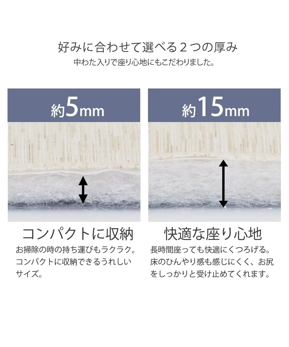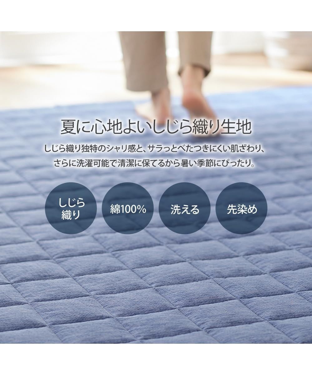 夏にぴったりな綿100%のしじら織ラグ。しじら織独特の細かい凹凸が素足に心地よく、汗ばむ季節におすすめです。インテリアに合わせやすい、アイボリーとグレイッシュブルーの涼し気でさわやかな2色をご用意しました。吸湿性に優れた綿素材でオールシーズン快適にお使いいただけます。ふっくら中わた入りでやわらかなクッション性です。汚れてもご自宅の洗濯機で手軽に丸洗いできるので小さなお子様やペットがいるご家庭にもおすすめです。夏らしく、さわやかな印象にしたい方におすすめです。