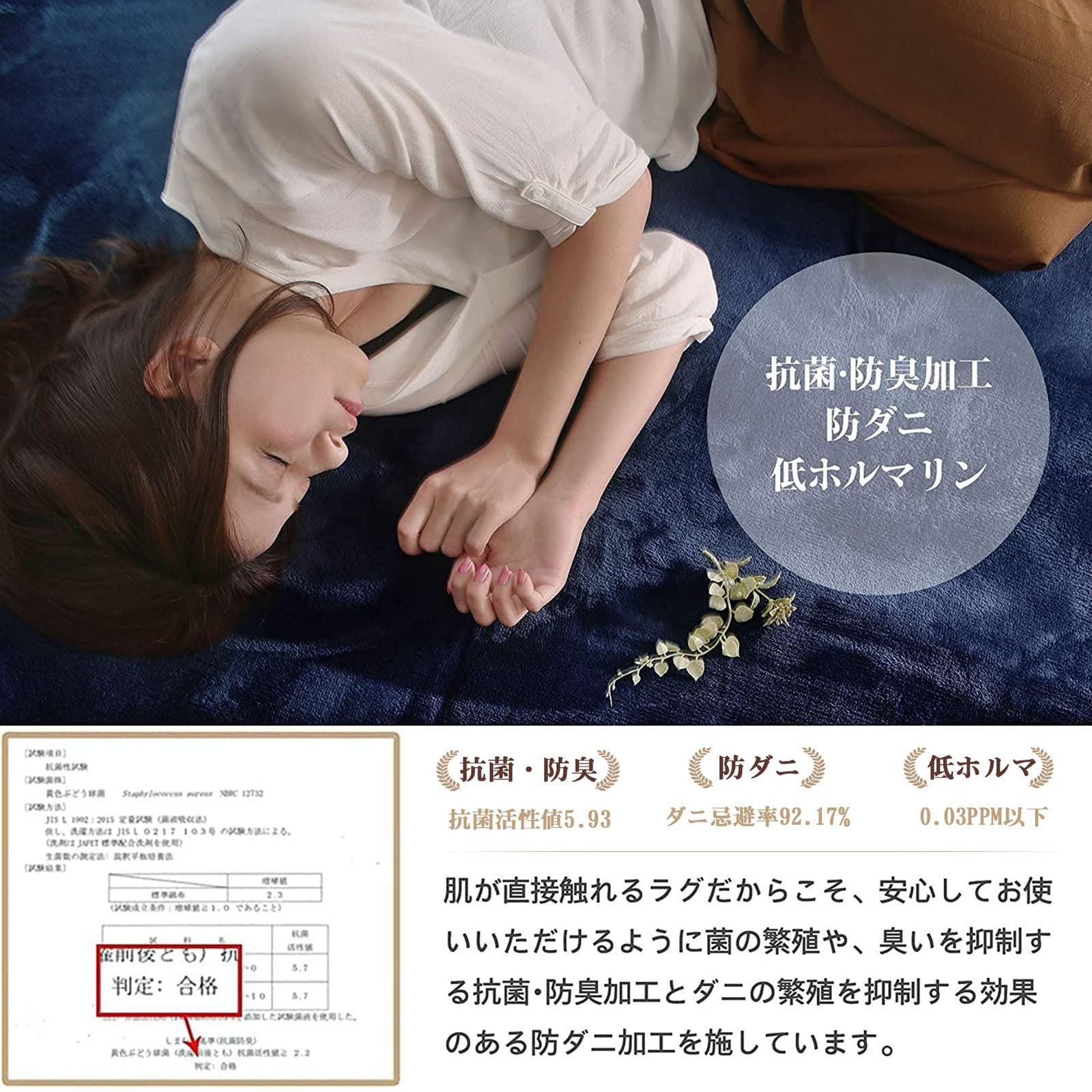 【抗菌・防臭・防ダニ】ラグの生地は、菌の繁殖を抑える「抗菌防臭」と「防ダニ」加工済で、小さなお子様やお年寄りのいるご家庭でもお使いいただけます。10回選択検査を実施して、丸洗いしても防ダニ効果は持続することを確認しています。