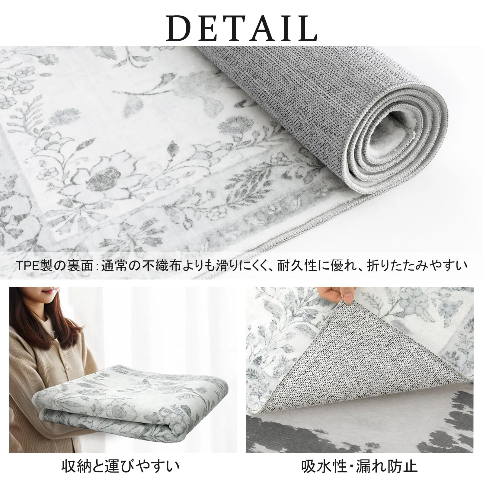 【商品仕様】サイズ:140x200cm、厚さ:約4~7mm、表面素材:100%ポリエステル、低反発カーペット。TPE材質の裏面:滑り止め、水漏れ防止。折りたたみやすくなるだけでなく、折り目も戻りやすくなります。オーバーロック加工の端、遊び毛が出たり、形を崩れたりしにくい。梱包:折り畳み (ご注意:裏面に滑り止め加工を施しているた め、床暖房の上に直接敷くのはおすすめしません。)