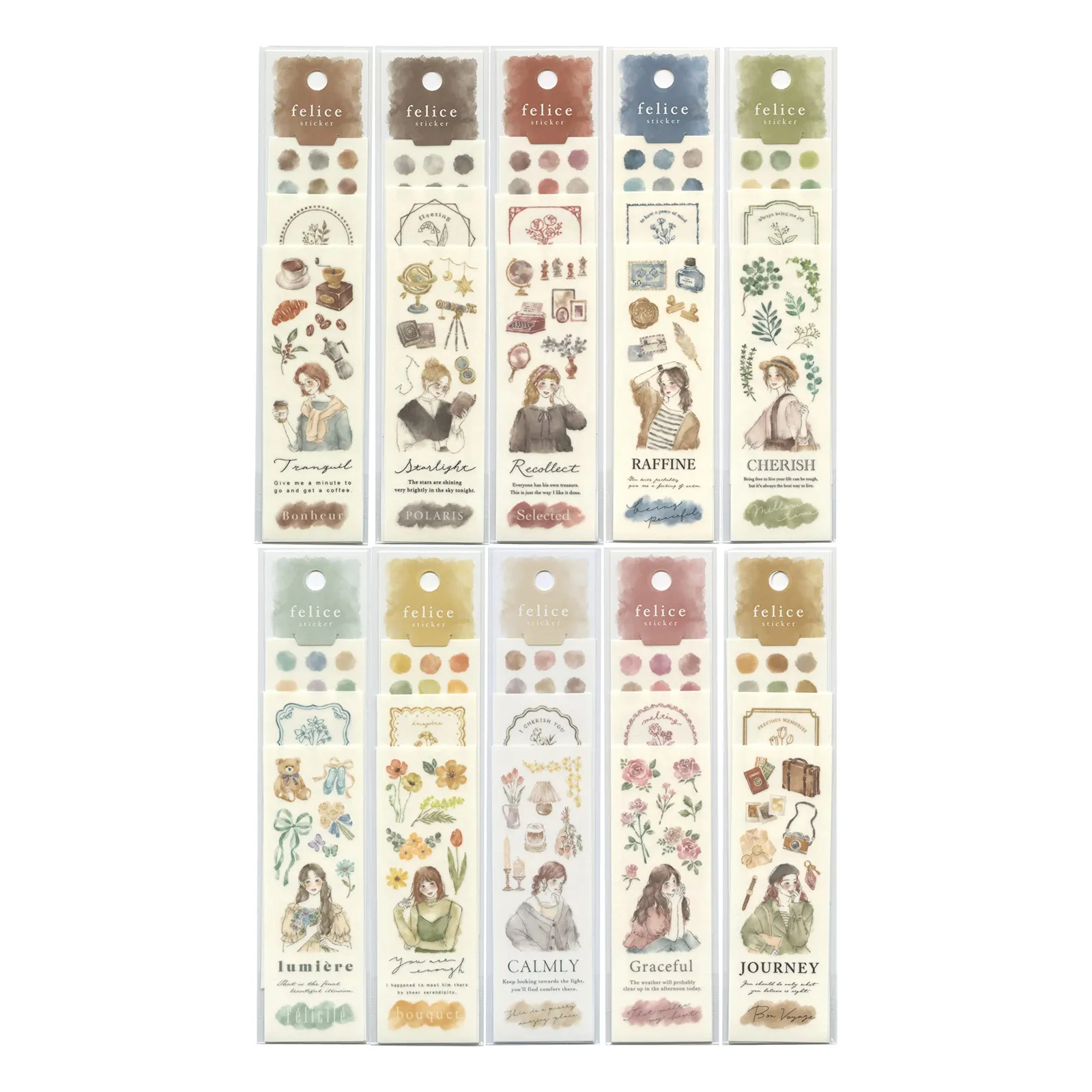 水彩タッチの女の子イラストや、繊細な文字ピースが絶妙に組み合わさり、貼るだけで物語が始まるようなデコレーションが完成します。