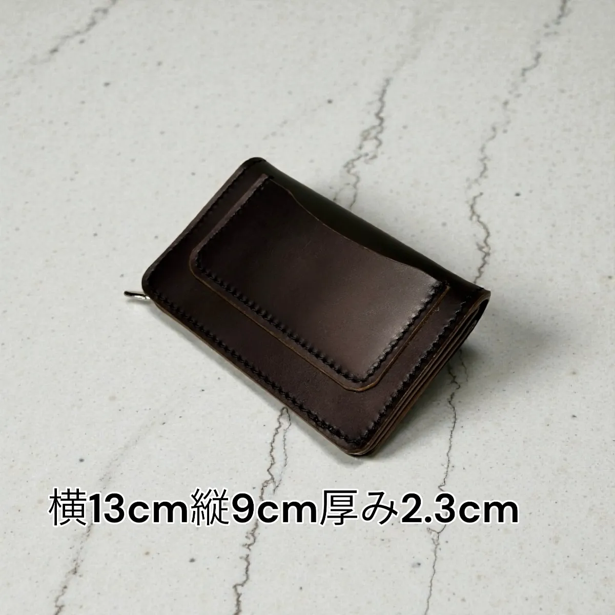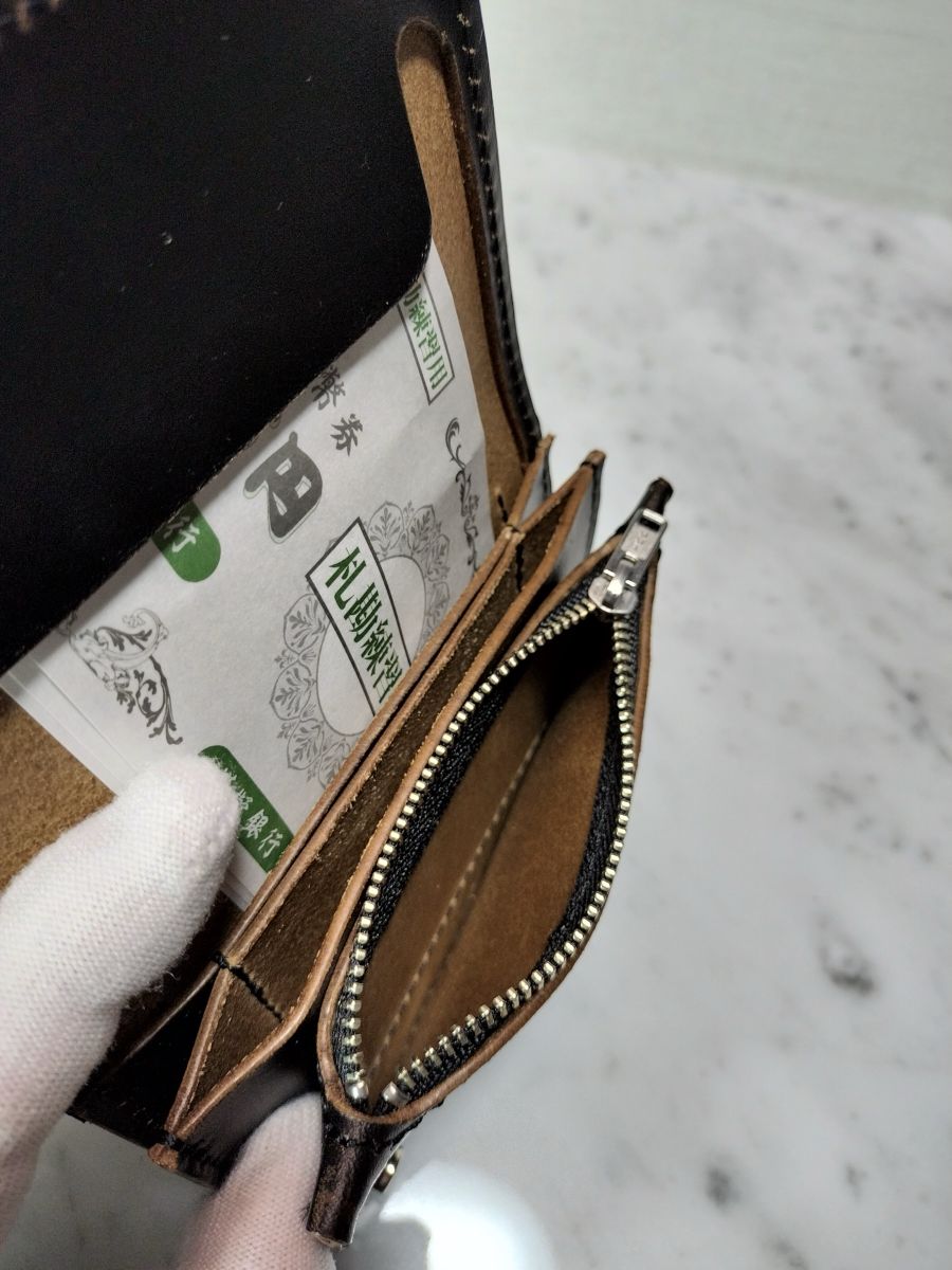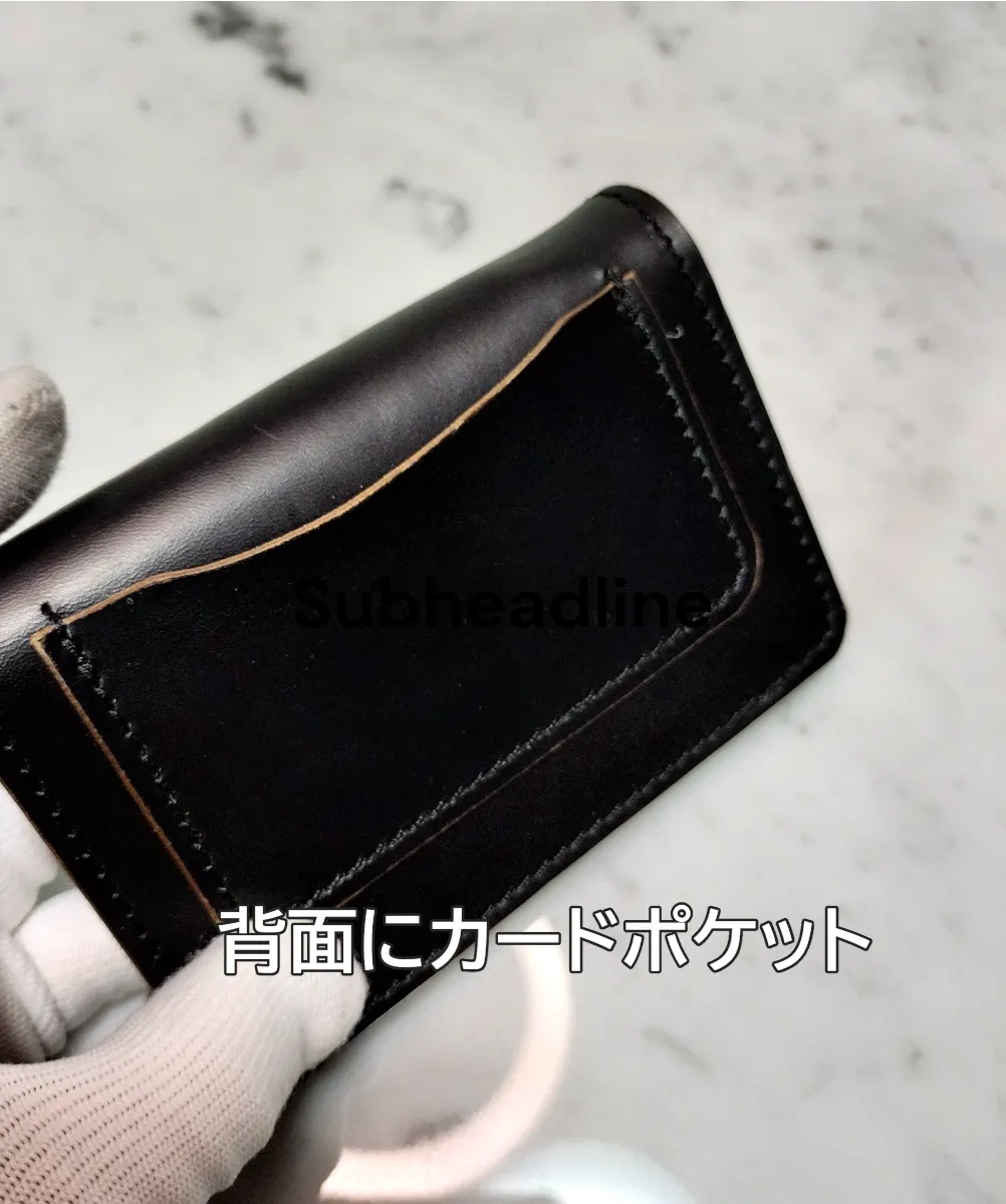 馬の「BUTT / バット」と呼ばれる線維密度の高い臀部(尻部分)を植物タンニンで鞣し、茶系の色で下地染色をした後、表面を黒の顔料で塗装した茶芯レザーになります。