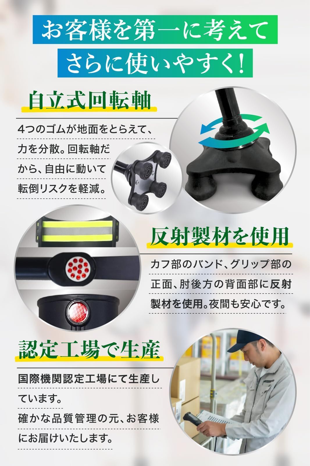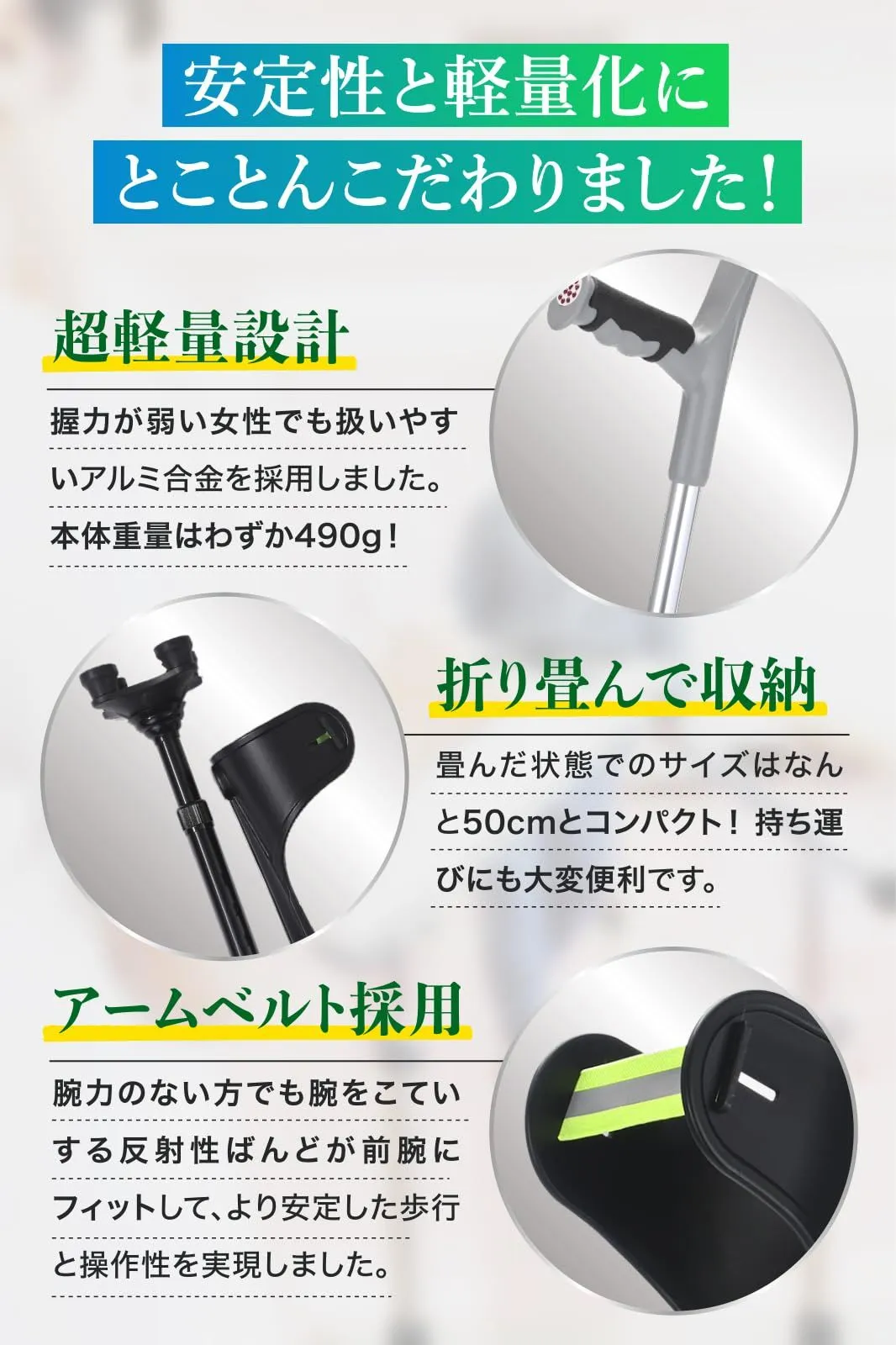 【安定性を強化】 アームベルト採用でグリップから手が離れても杖を落とす心配がなく、ゴム製の足がしっかりと地面を掴むので安心してご使用できます。