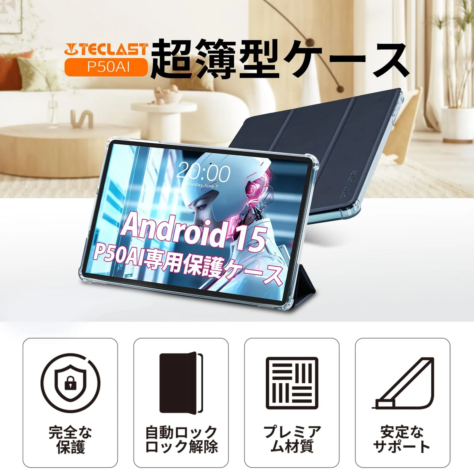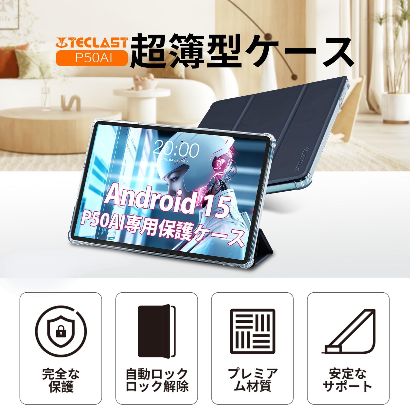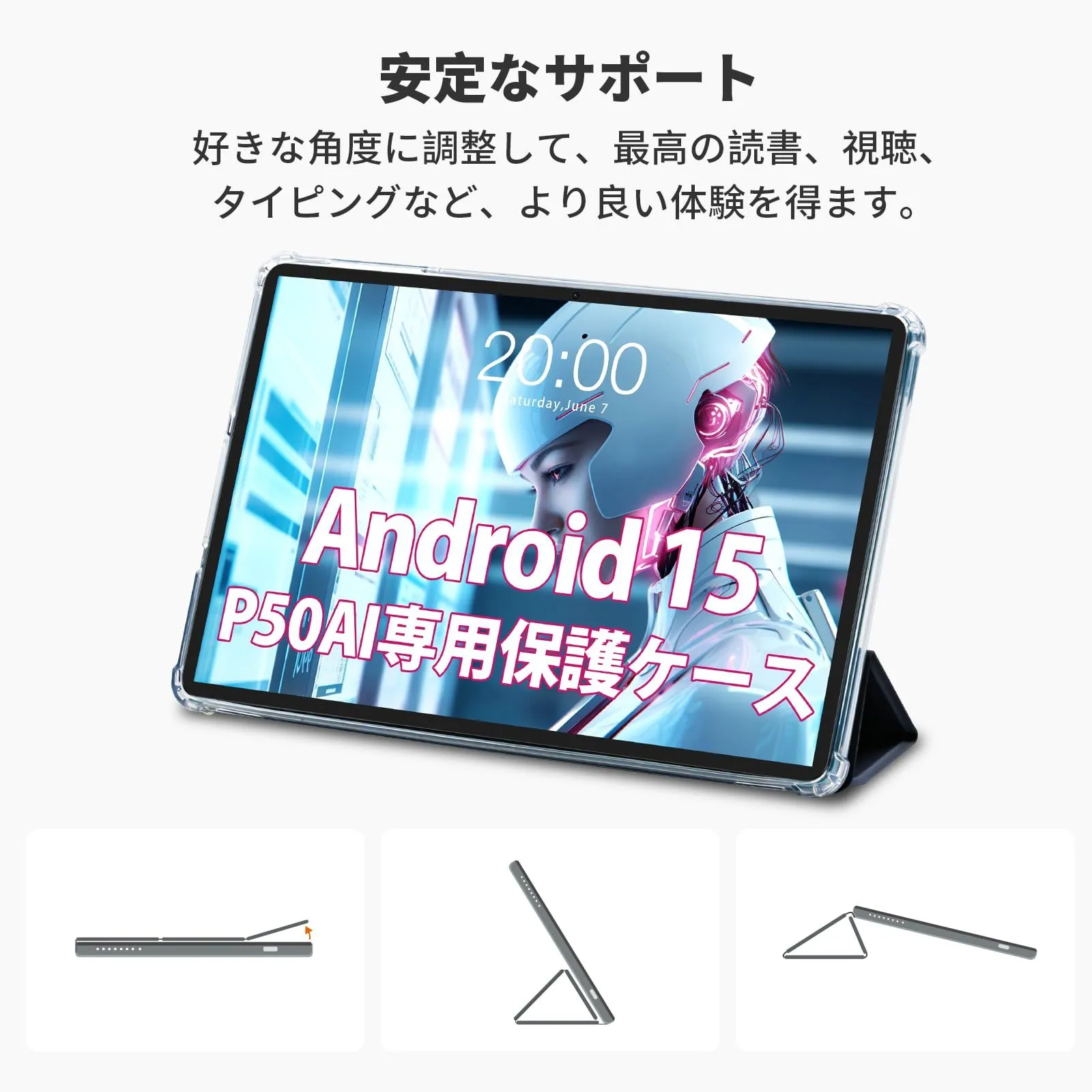 TECLAST P50 AI Android 15タブレット 専用保護ケース、3段階角度調整、三つ折りスタンド、 ハードバックシェルスマート保護カバー