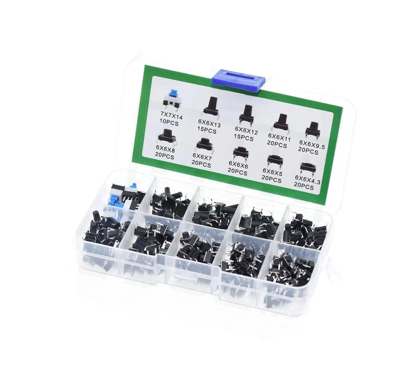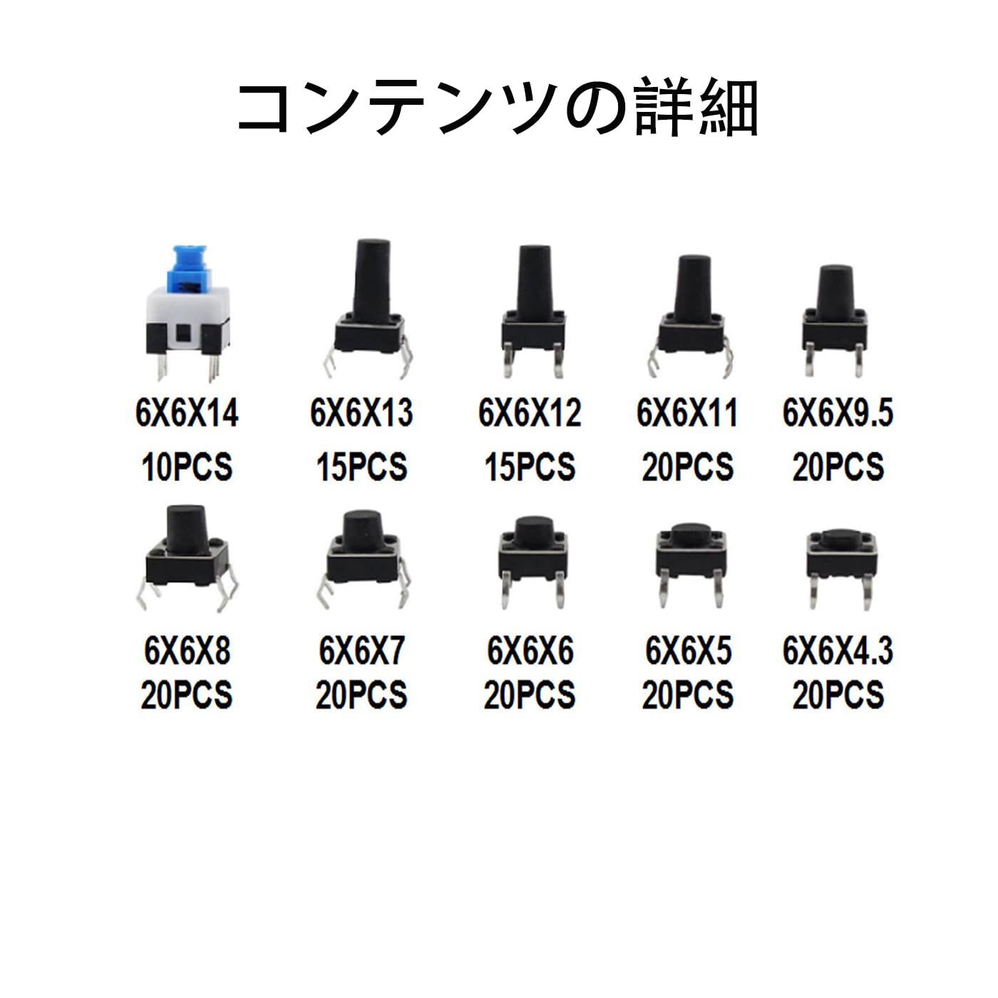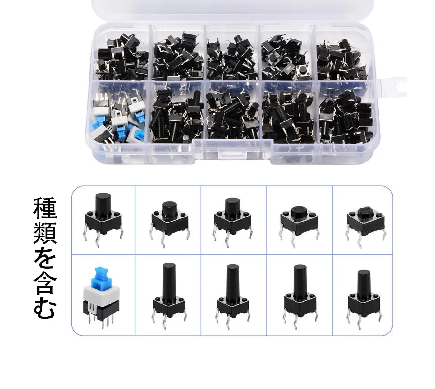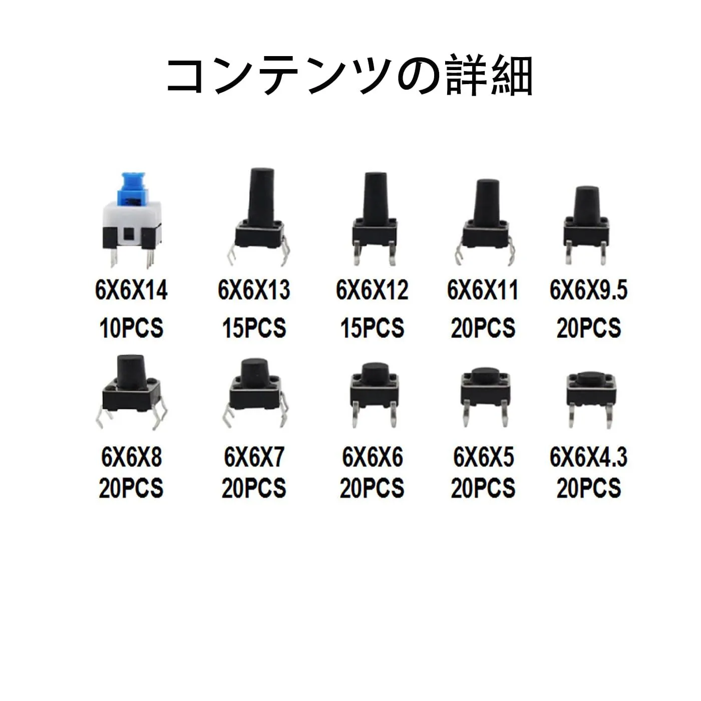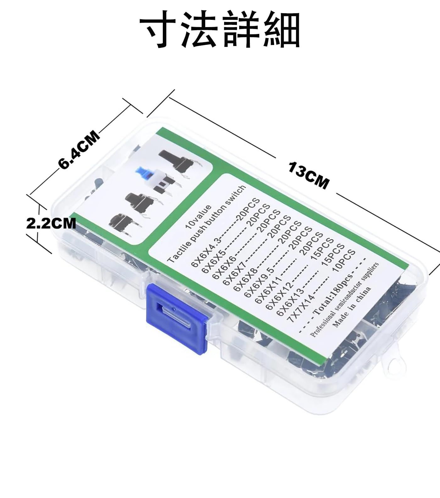 【セット内容】押しボタンスイッチ180個、10種類のサイズが含まれています。サイズは7x7x14mmから6x6x4.3mmまで、各サイズ10個から20個ずつ。プラスチックケース1個が付属しています。