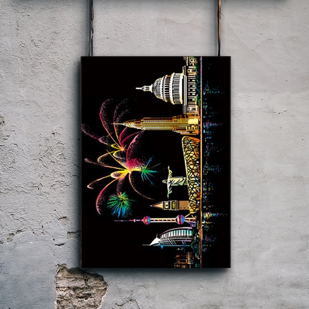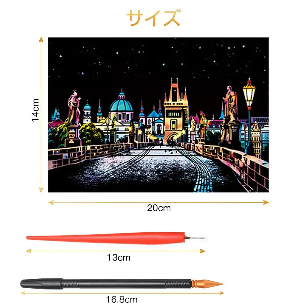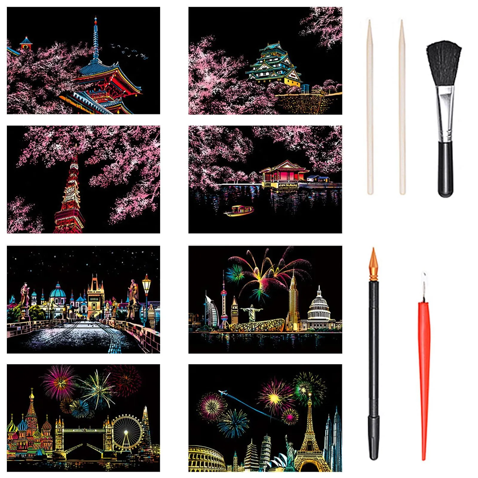LIANHATA スクラッチアート 8枚入 スクラッチ極細ペン付き 20*14cm スクラッチペーパー レインボー絵 夜景 花火 観覧車 花畑 彫刻アート DIY 削るだけで美しいアート 部屋飾り (コンビネーションシリーズ)