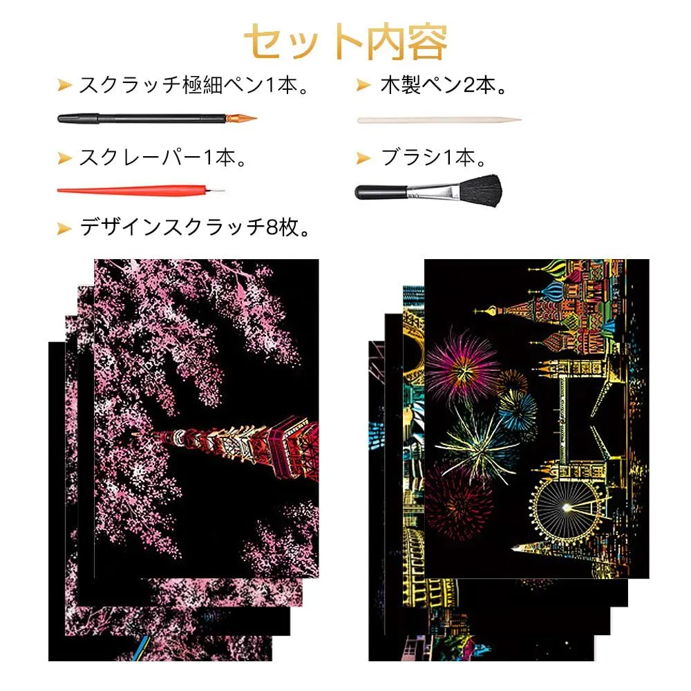 【セット内容】デザインスクラッチ8枚、木製ペン2本、スクラッチ極細ペン1本、ブラシ1本。