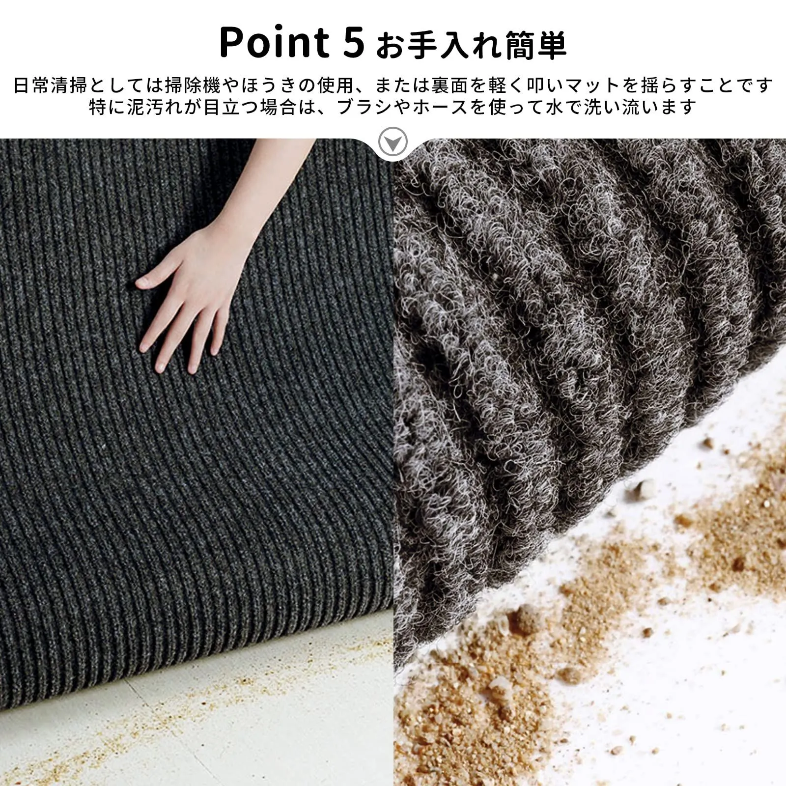 【泥落とし&吸水】屋内、屋外でお使いいただける泥落としマットです。玄関マットの表面がポリプロピレン繊維で靴底の砂や泥を取り除き、お部屋のフロアはいつでも清潔に保たれます。雨傘やレインコートから滴る水を瞬時に吸収、優れた吸水機能で、雨天や積雪時の玄関のお悩みを解決します。一年中も快適にご使用いただけます。