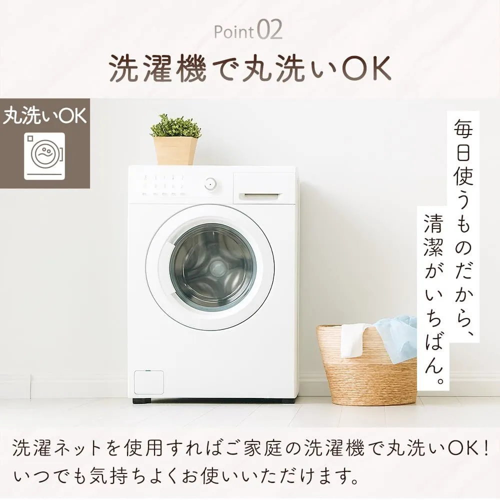 家庭用の洗濯機で丸洗いでき、いつも清潔に保てます。洗濯ネットをご使用の上、他のものと分けて洗うことをお勧めします。漂白剤の使用とタンブラー乾燥は避けてください。