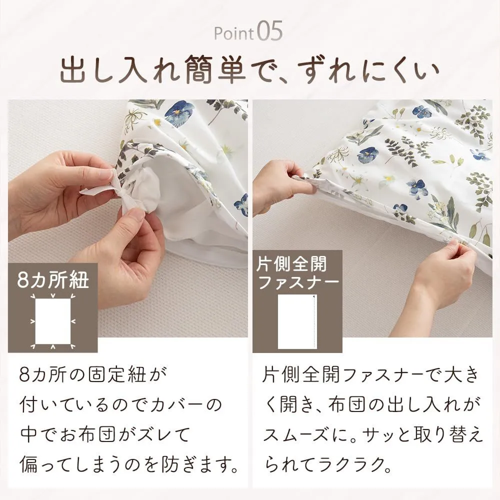 8か所ひも付きで、しっかりとお布団を固定しずれにくい仕様です。全開ファスナーで、布団の出し入れも楽々な掛けふとんカバーです。