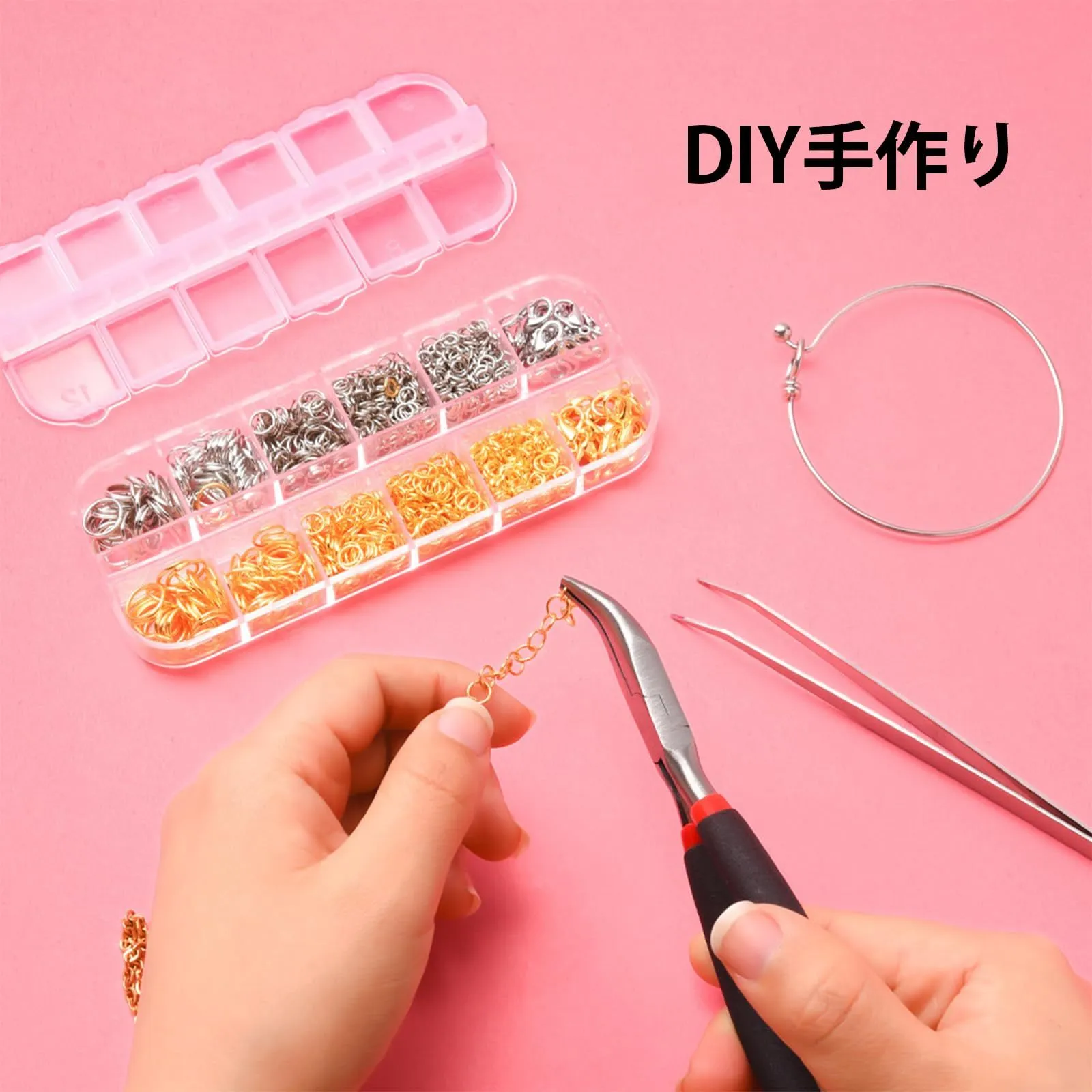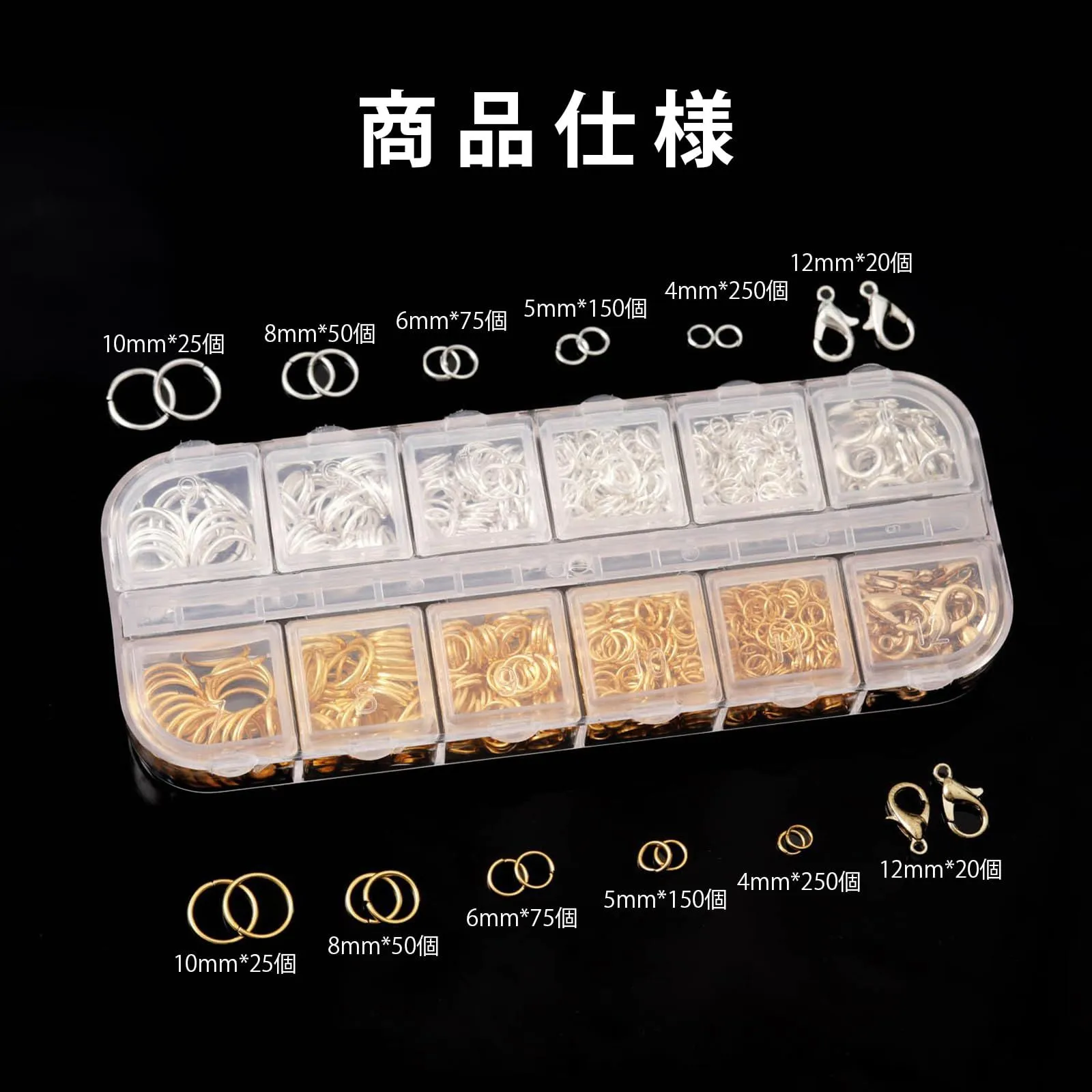 【セット内容】2色の丸カン:4mm×250個/色、5mm×150個/色、6mm×75個/色、8mm×50個/色、10mm×25個/色、カニカン:12mm×20個/色が含まれています。