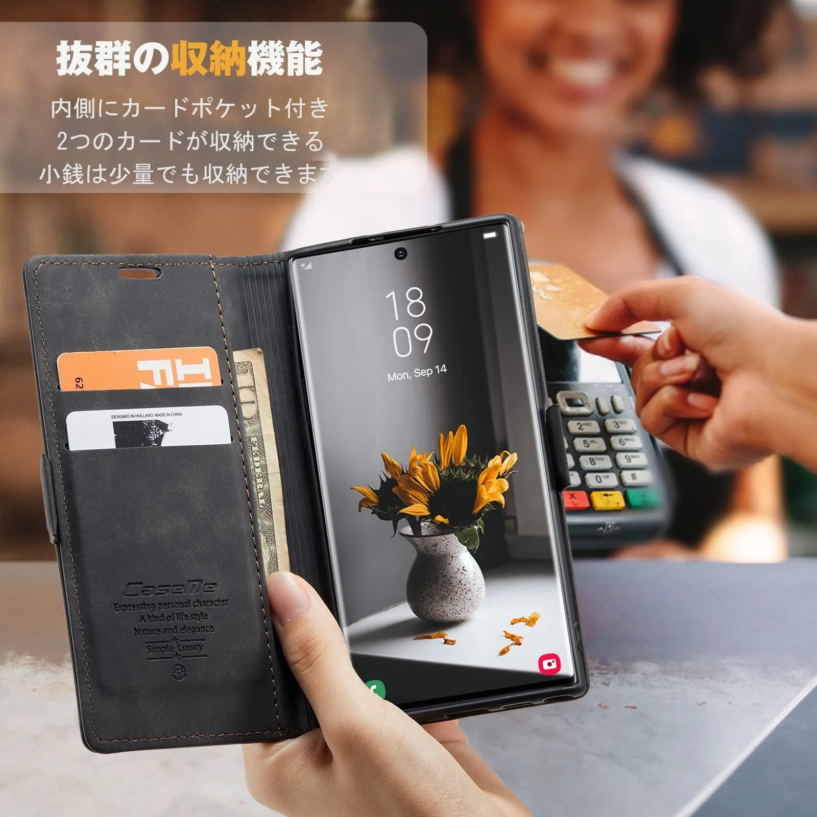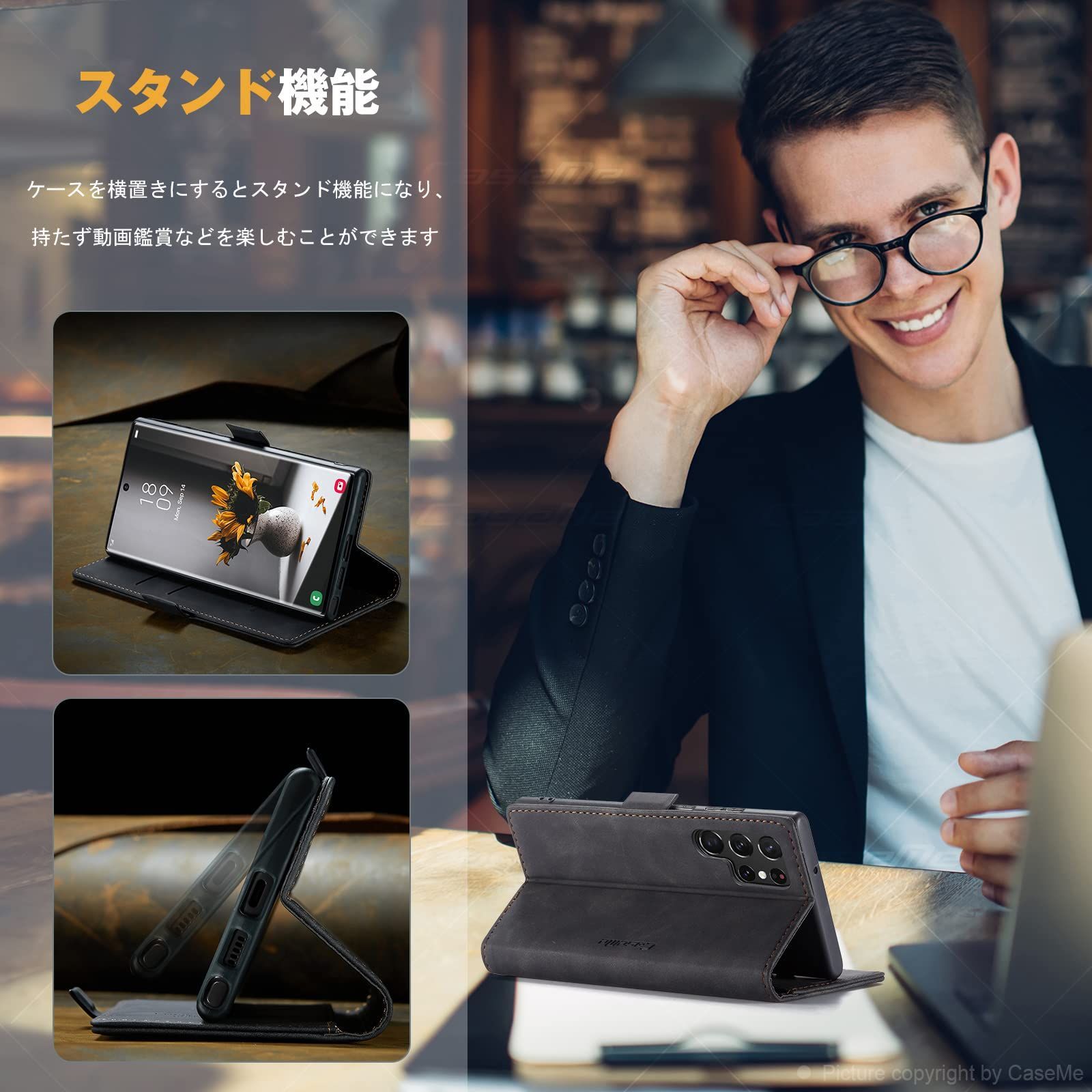 『 メチャメチャ便利』 ケースの内側にカードポケット付き、三つのカードが収納できる、小銭は少量でも収納できます。なお側面マグネット方式によりマグネットによるカード磁気不良が除去された。横置きスタンド機能が付いて、好きな角度で動画鑑賞や読書などを楽しめます。