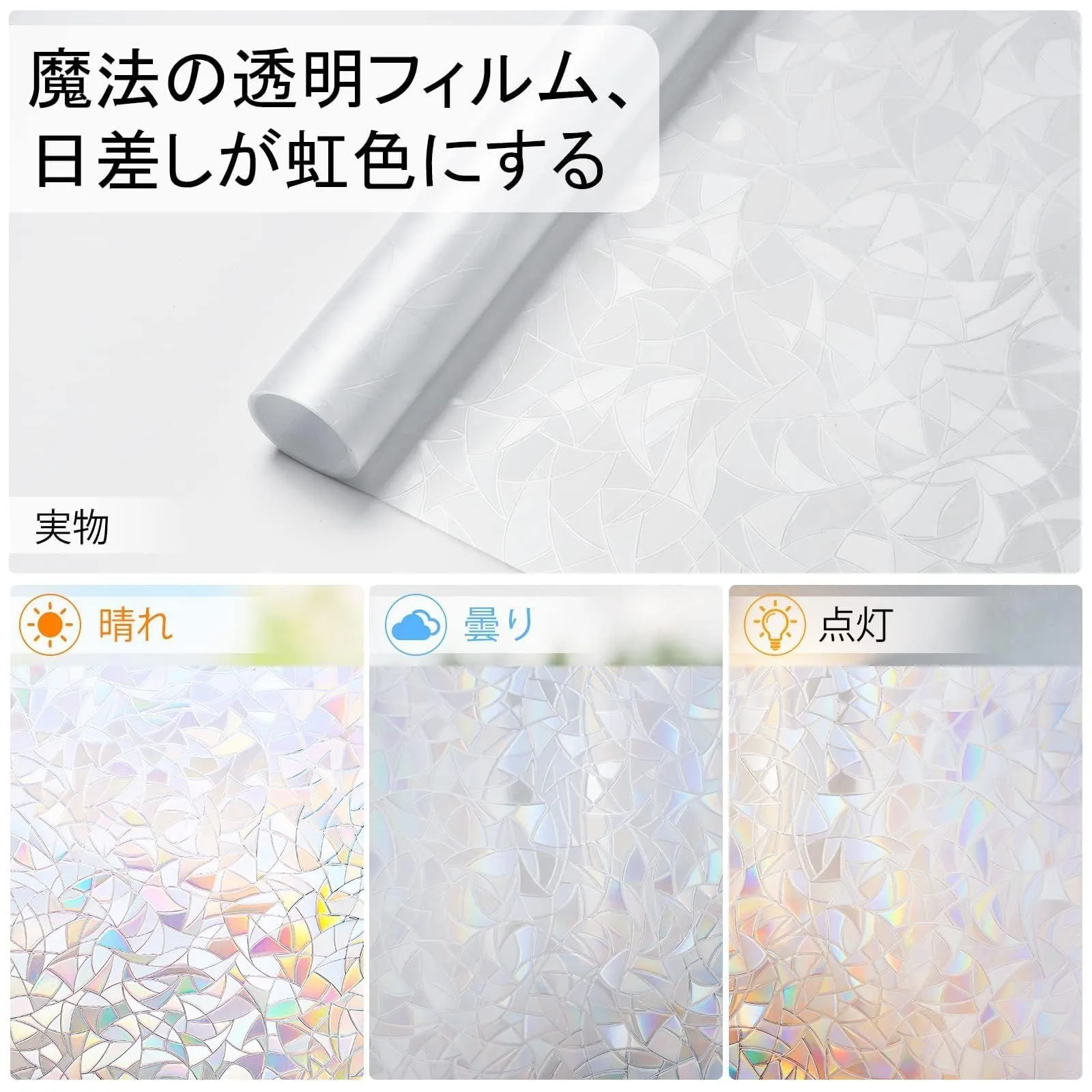 目隠し・UVカット:日差しやライトの光などのあたる所にはれば、虹色になったりし、可視光を反射して目隠しになったりします。光が強ければ強いほどカラフルになります。また、紫外線UVA 84%・UVB99% 以上カットし、際の家具や床材の劣化、肌にもたらす損害を大幅軽減します。要注意:設置の成功は使い方次第です。商品の説明ページの使い方と注意事項を丁寧にお読みください。