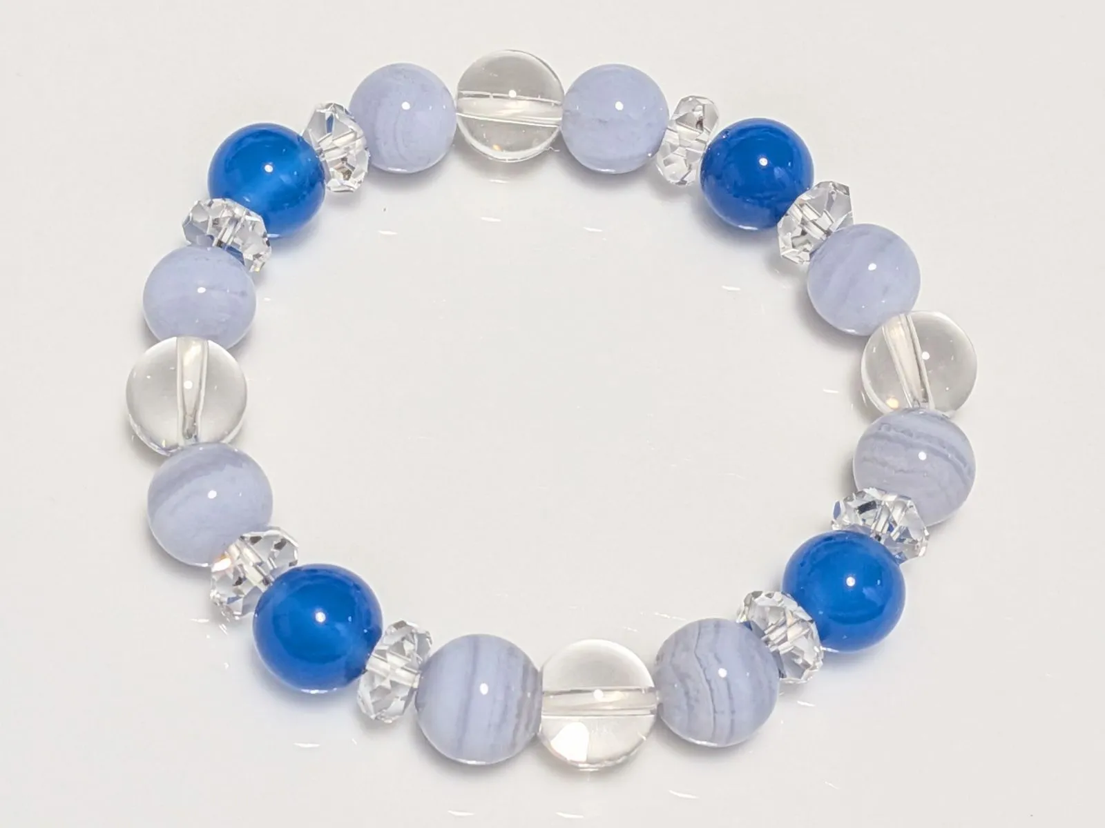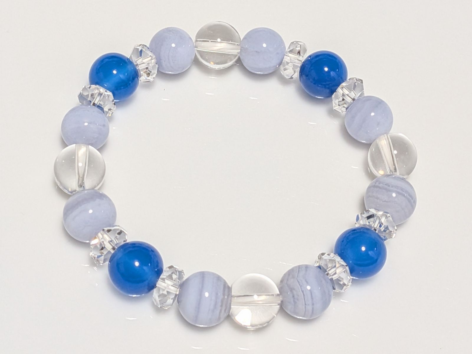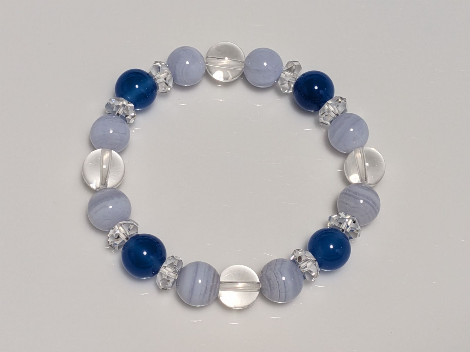 ご覧いただき、ありがとうございます。 10mmのブルレースアゲート、ブルーアゲート、水晶、ボタンカット水晶を組み合わせました。 ブルーと薄紫にとても癒されます! ブルーレースアゲート 「人間関係を良好にする、安定の石」 ブルーアゲート 「人との絆を強め、つながりを感じる石」 水晶、ボタンカット水晶 「浄化、お守り、魔除け、あらゆる幸運を呼び寄せる、万能の石」 ご質問などございましたら、お気軽にお問い合わせ下さい。