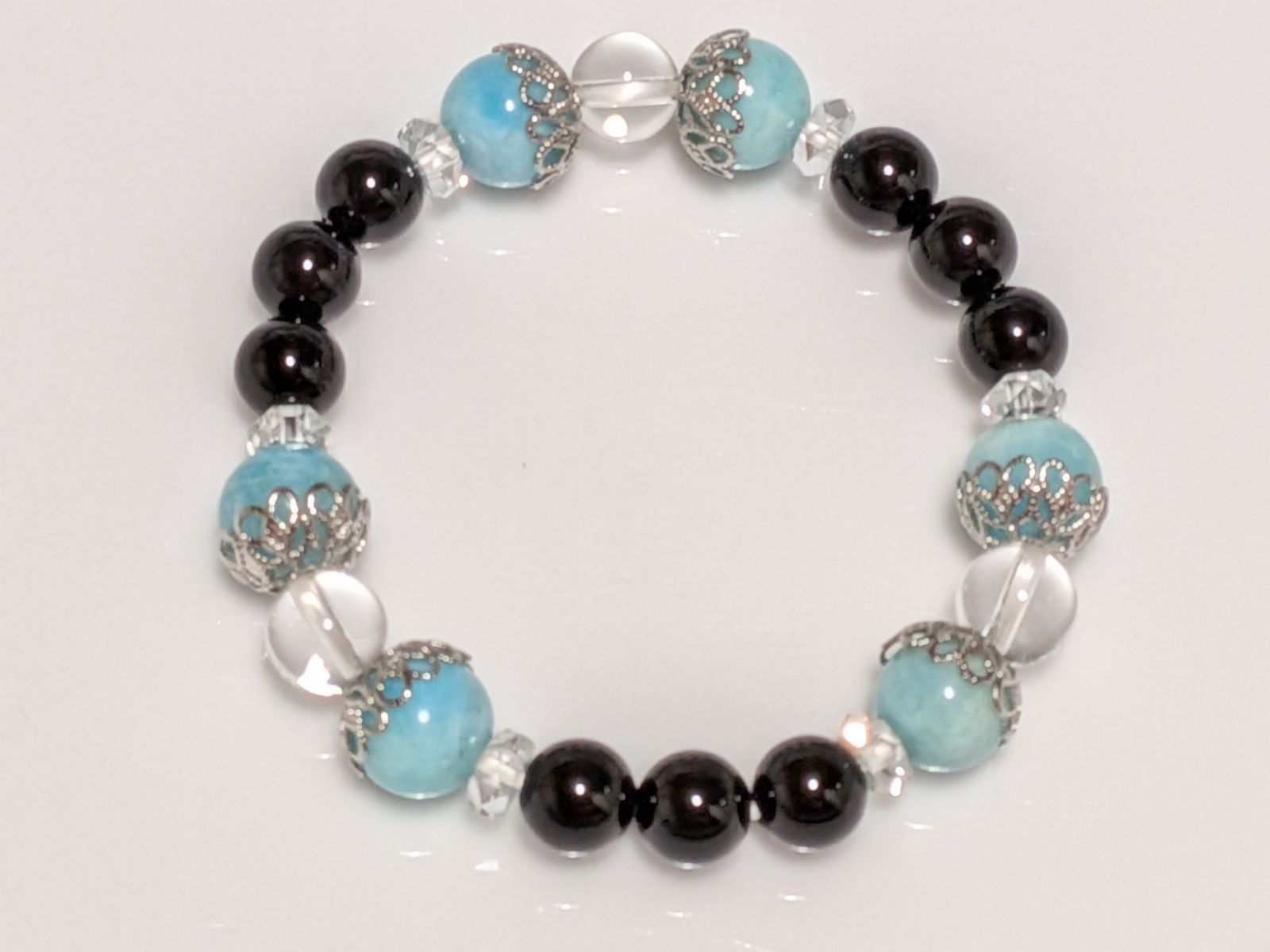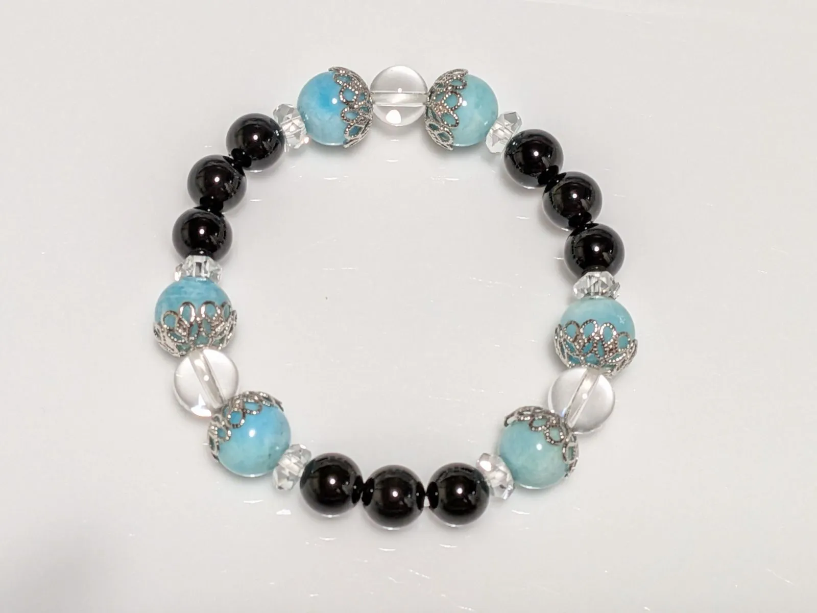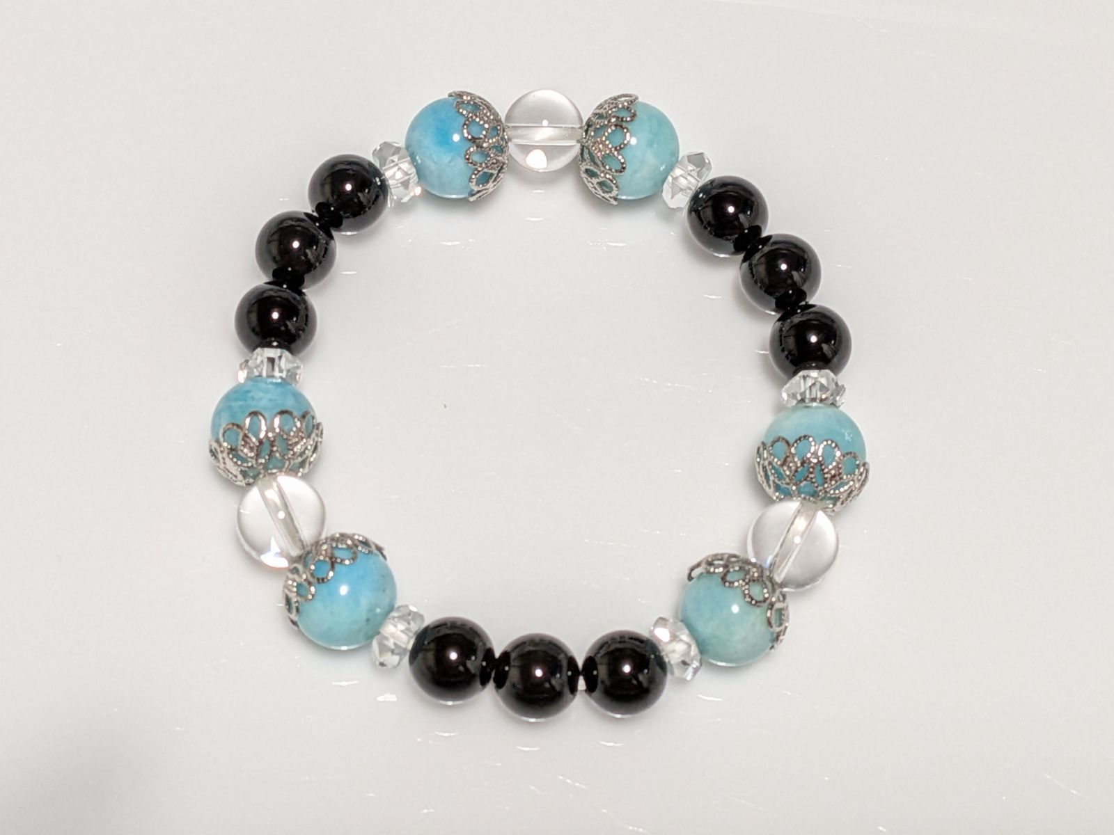 ご覧いただき、ありがとうございます。 8~10mm玉のアマゾナイト、オニキス、水晶、ボタンカット水晶を組み合わせました。 とてもカッコよくて、お洒落です!! アマゾナイト 「迷いを取り去り、幸運を呼び込む石」 オニキス 「トラブルから身を守る、魔除けの石」 水晶、ボタンカット水晶 「あらゆる幸運を呼び寄せる、万能の石」 サイズ 14cm ご質問などございましたら、お気軽にお問い合わせ下さい。