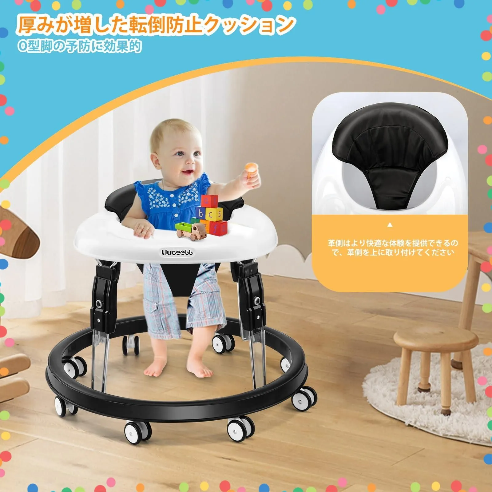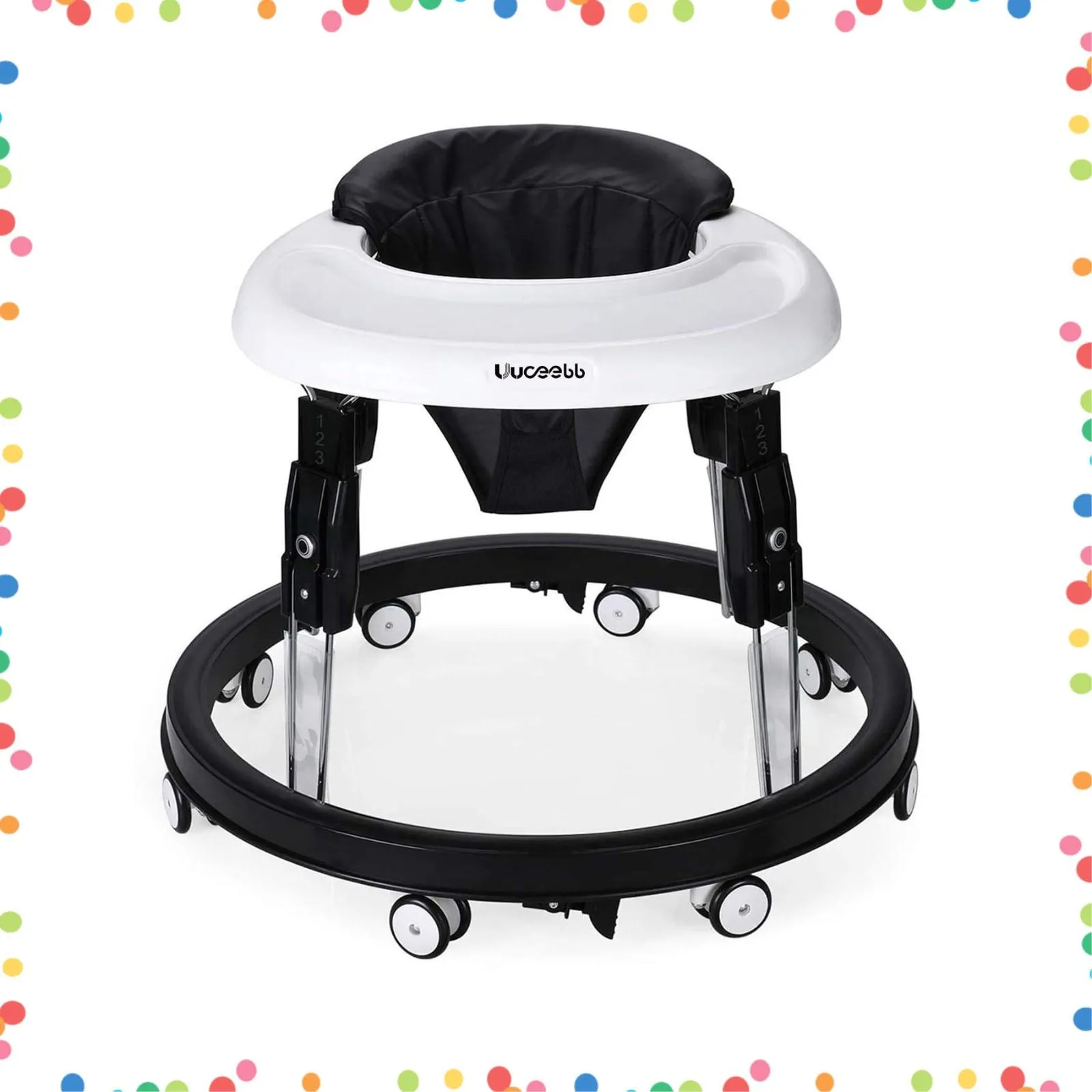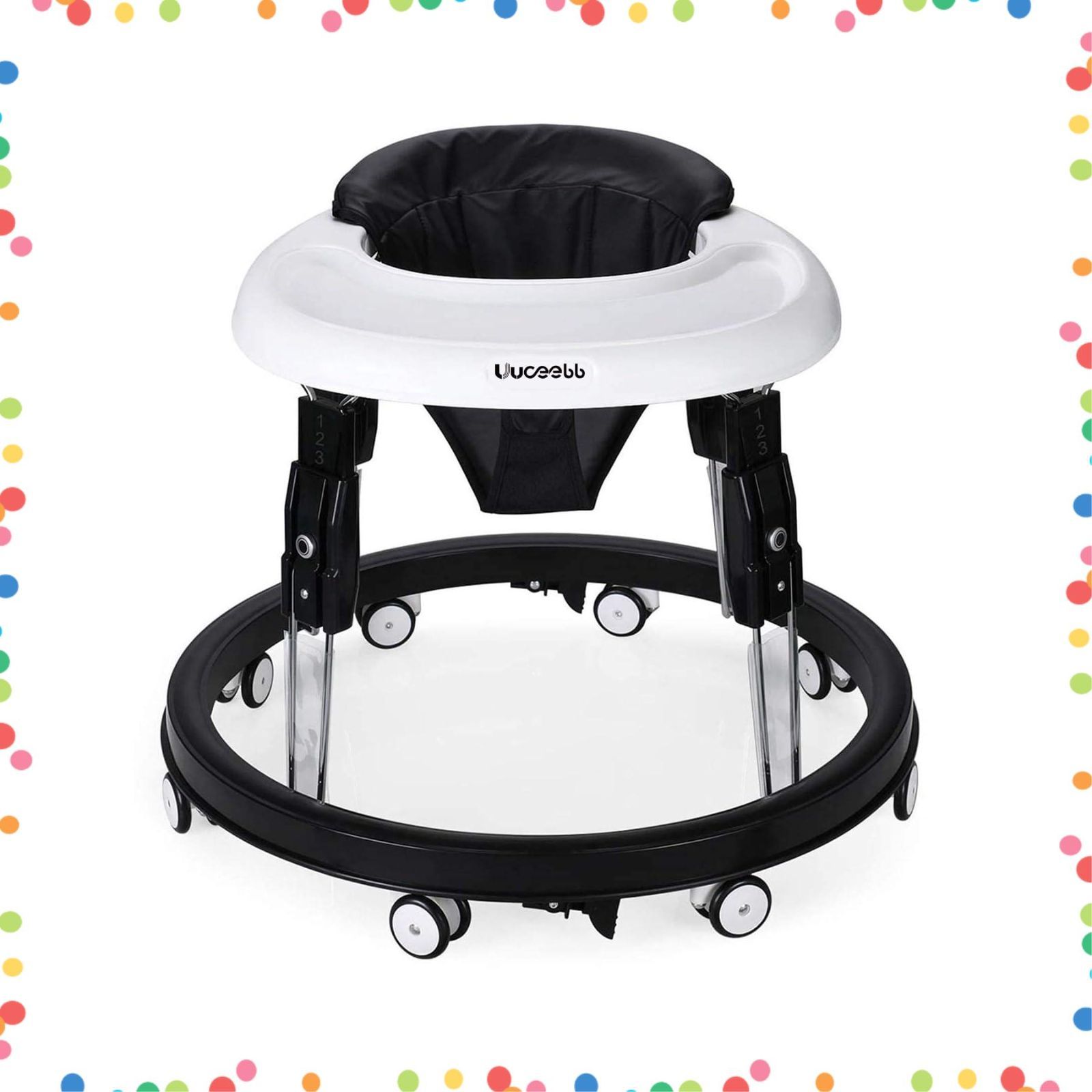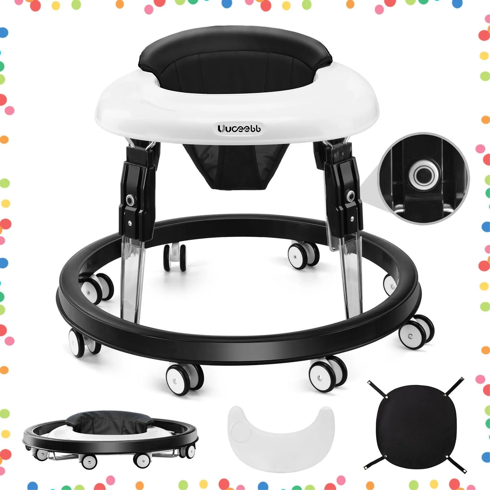 【ワンボタン折りたたみボタンデザイン】 uuoeebbの特許取得済みデザイン、新しい高さ調整方法、ワンボタン折りたたみボタン。 片手でボタンを押すだけで調節でき、高さ調節操作がより簡単で便利になります。さまざまな床に適した360度回転する車輪、柔らかいプラスチック製、8つの車輪+交換用車輪で実用性アップ。