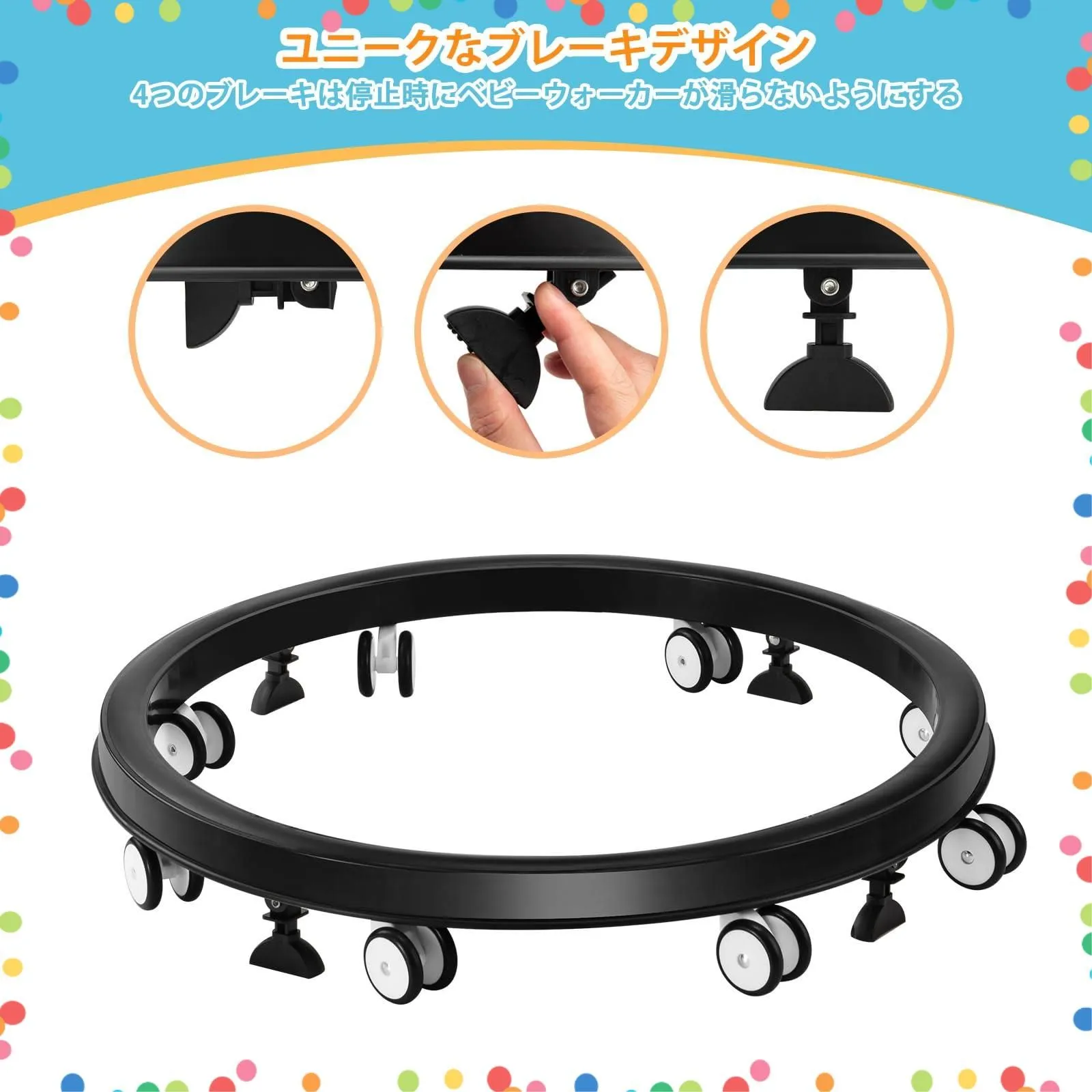 【パーキング ブレーキ デザイン】 下には4つのブレーキがあり、お子さんが動き回るたくない場合はブレーキをかけておけば安心して、自分のことをすることができます。柔らかいプラスチック製の保護カバーが特別に追加されており、赤ちゃんの足の引っ掛かりを防ぎます。