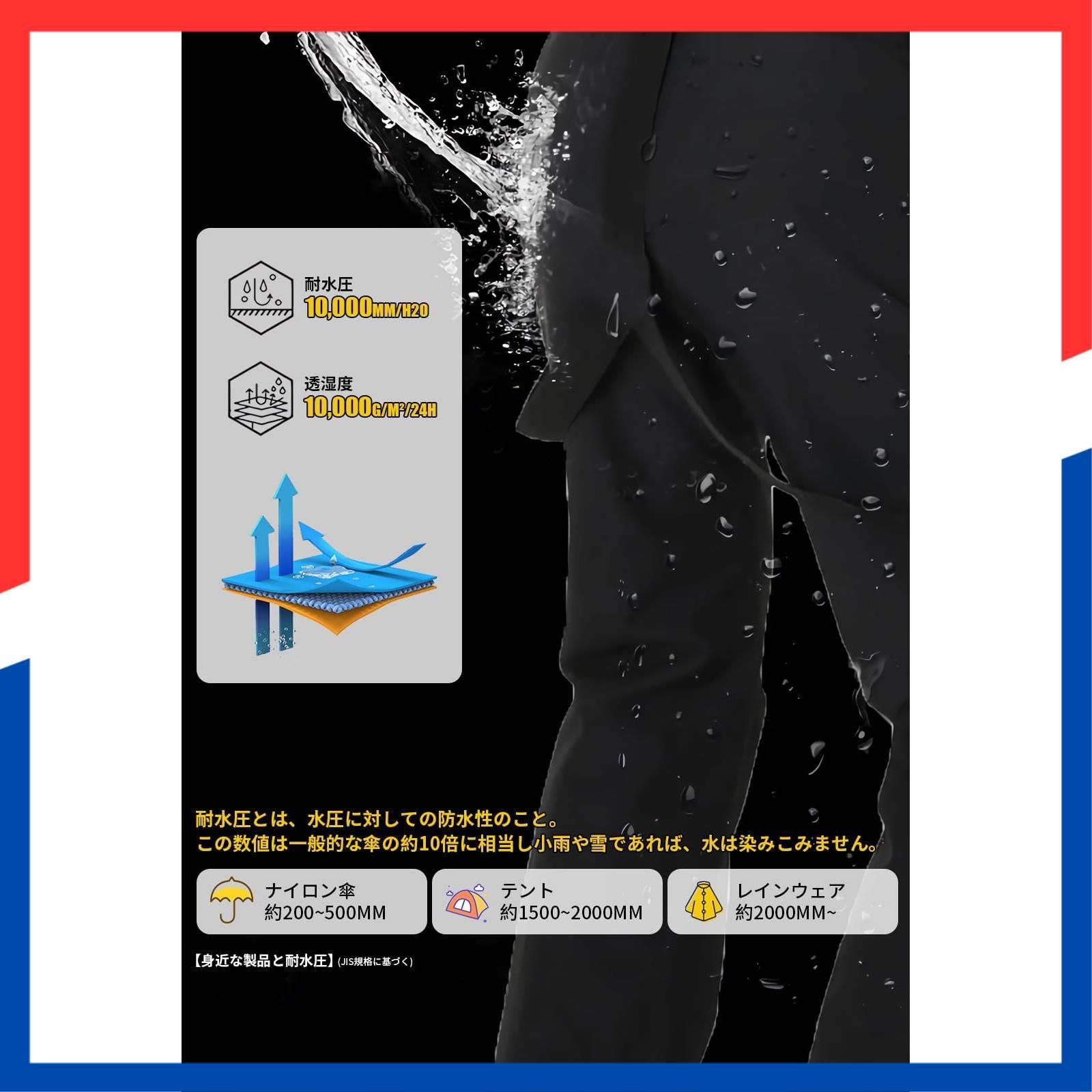 【厳選された素材】耐水性、透湿性、撥水性、耐摩耗性に優れたポリエステル繊維加工素材を採用し、耐水圧10000mm、透湿度8000g/m2/24hです。表地には防水・防風素材を使用し、中地には保温性に優れた高機能中綿素材を、裏地には静電気防止加工を施しています。三層構造により外からの冷たい風をしっかりブロックし、体の熱を逃さず保温します。冷たい風の侵入を防ぎ、体の冷えを防ぎます。