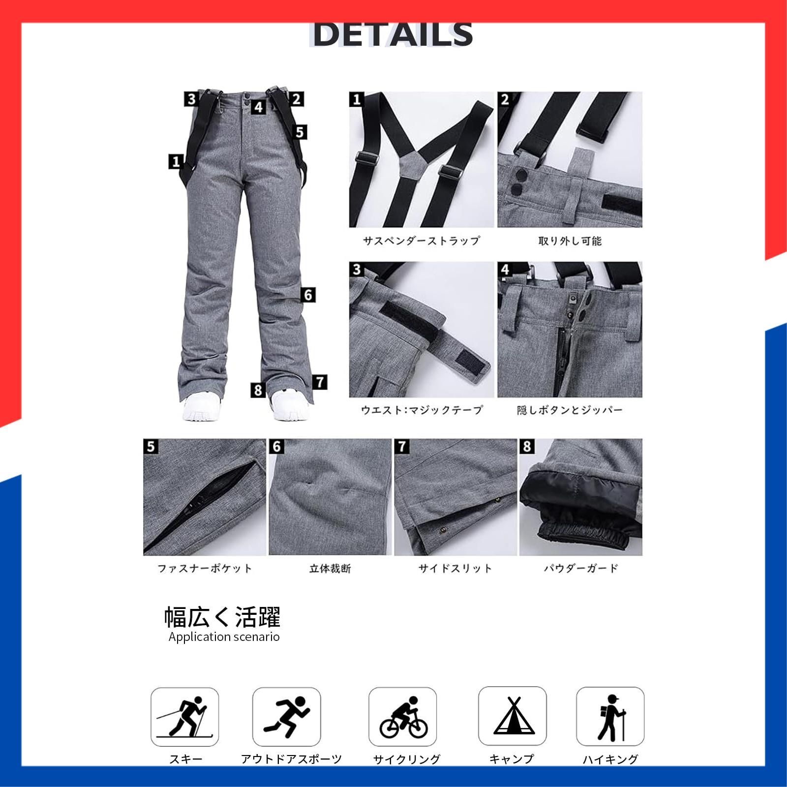【機能性満載】取り外し可能な調節可能なサスペンダーストラップがパンツを所定の位置に保ちます。ウエストにはマジックテープでウエストの緩さを調節することができます。また、ウエストは隠しボタンとジッパーのダブル構造で安心で、丈夫で長持ち、雪の浸入を防止しやすくなります。脱着にとても便利です。