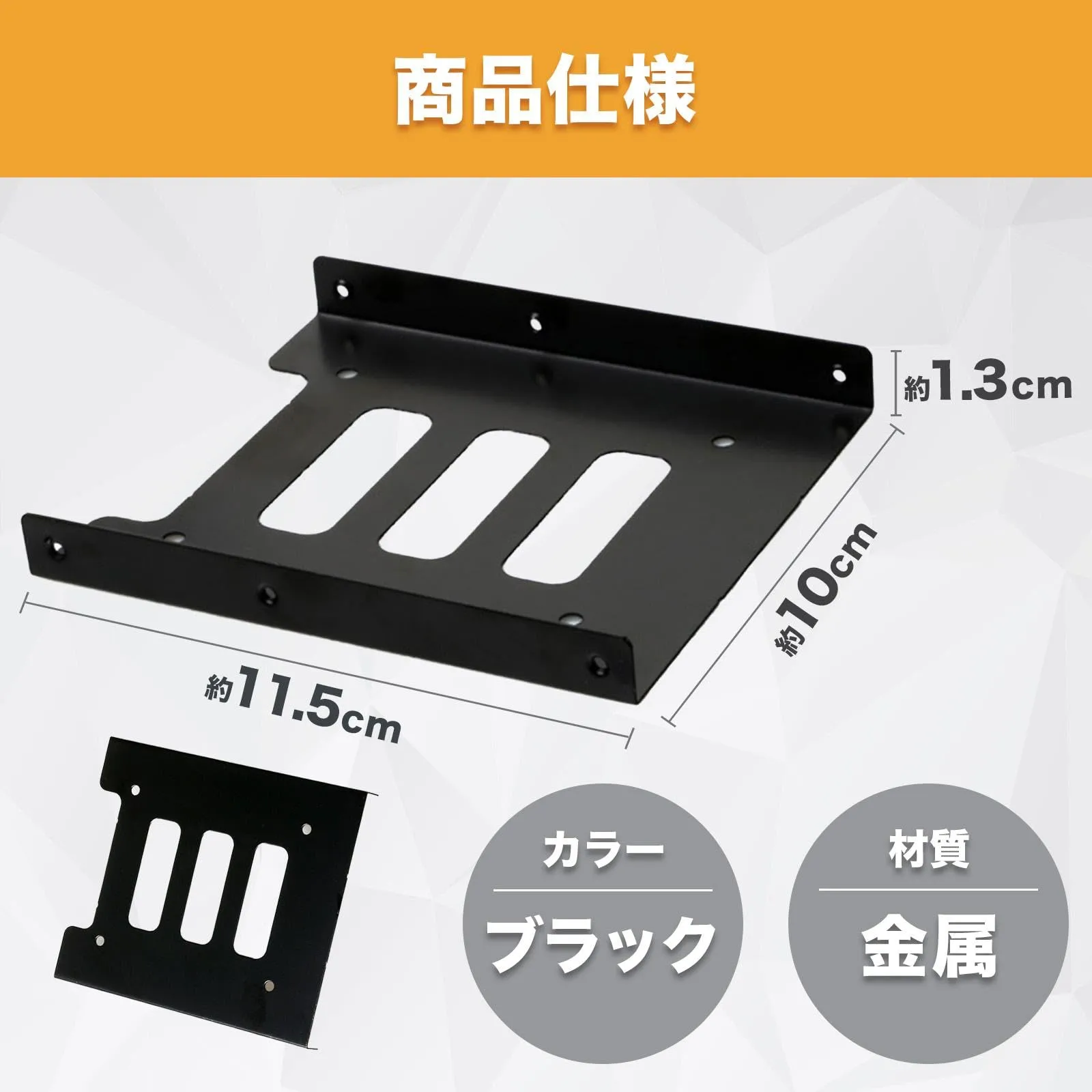 このHDD/SSD用変換ブラケットは、2.5インチのHDDやSSDを3.5インチのドライブベイに取り付けるための便利なアクセサリーです。