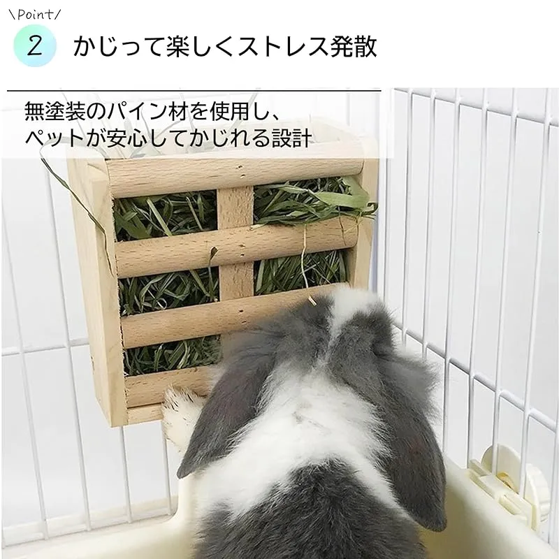 【かじって楽しくストレス発散】無塗装のパイン材を使用し、ペットが安心してかじれる設計です。自然の木の感触が歯の健康をサポートし、適度なかじり心地がストレス解消にも役立ちます。チモシーを食べながら遊べる、心地よい牧草入れです。