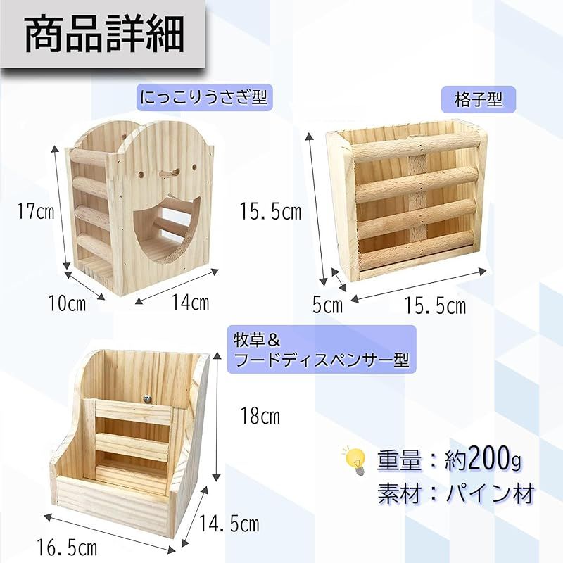 【商品詳細】にっこりうさぎ型:14×10×17cm、格子型:15.5×15.5×5cm、牧草&フードディスペンサー型:16.5×14.5×18cm 重量:約200g 素材:パイン材