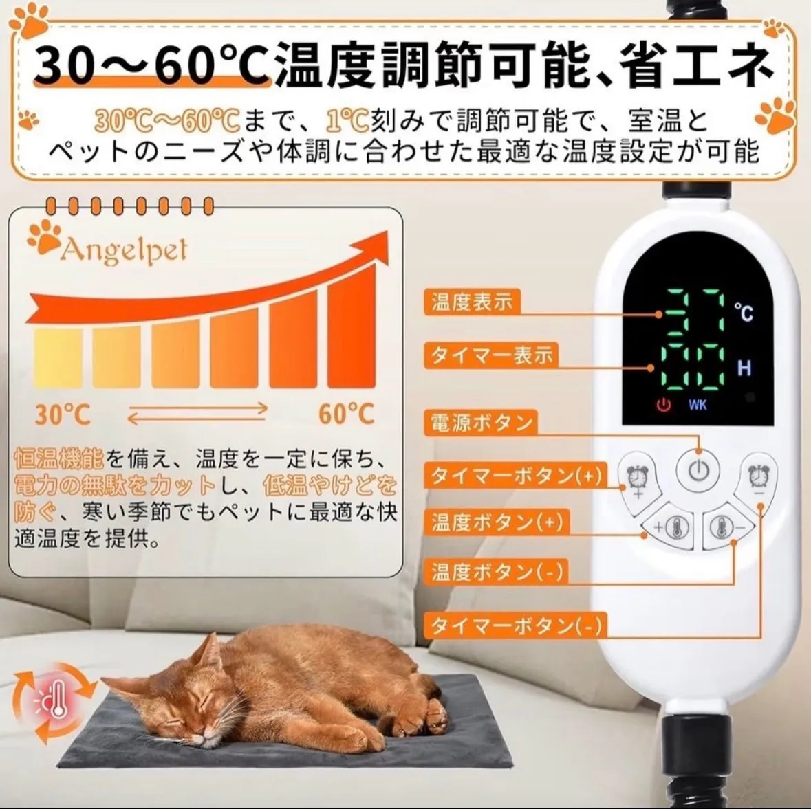 【30℃~60℃温度調節 & 恒温機能】当ペット用ヒーターは気候やペットの体調に合わせて30℃~60℃の範囲で1℃刻みで精確に温度を調節できます。ぽかぽかでちょうどいい暖かさ、すぐに暖まり快適に眠まります!優れた恒温機能を備えており、このペット用ホットカーペットは、内蔵のサーモスタットにより温度を調整し、設定温度に合わせて電源を自動的にオンとオフに切り替え、一定の温度を維持します。これにより、無駄な電力の消費を削減し、低温やけどのリスクがゼロ!