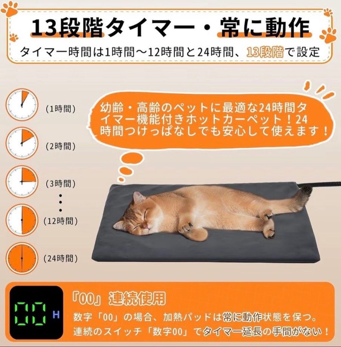 【14段階:1~12時間タイマー+ 24時間タイマー+常に動作】ご必要に応じて適切な時間(1/2/3...12H)を1時間単位で12段階で設定することができます。このペット用ホットカーペットには新たに24時間のタイマー機能も搭載しており、24時間後には自動的に電源が切れるため、安心して長時間使用が可能です。これにより、類似製品よりも細かくタイマー設定と幅広い選択肢が可能になります。時間を設定せずに連続使用したい場合は、タイマーを「00」に設定すれば常に動作になります。設定した時間に達した後、再びオンにするのを忘れる心配はありません。寒がりの愛犬や愛猫にぴったりの防寒対策品です。