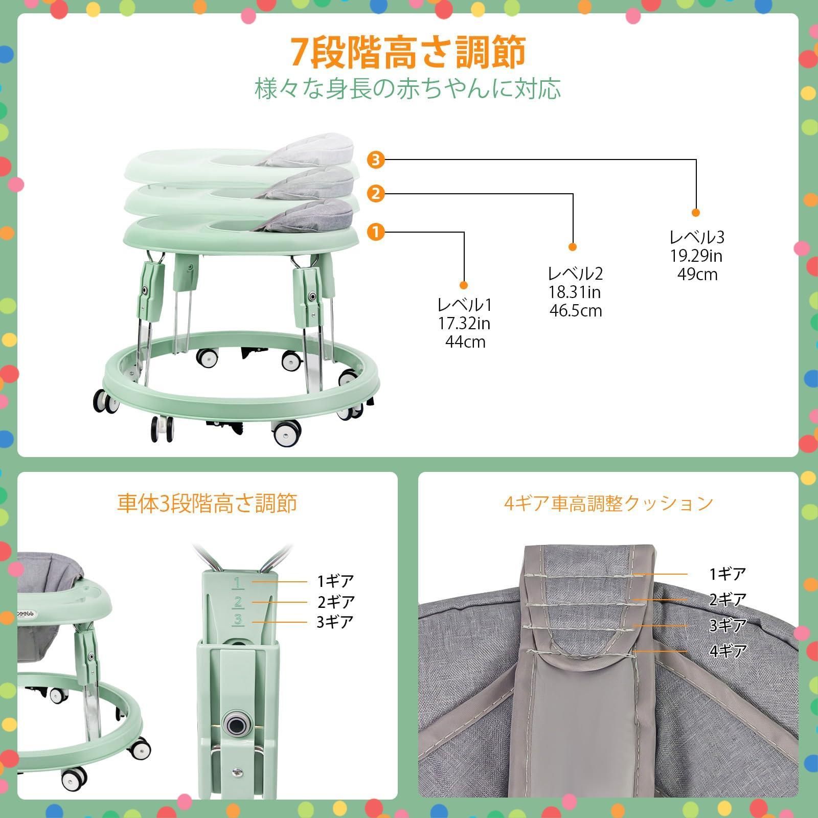 【5段階の高さ調節】Uuoeebb U1ベビーウォーカーは、3段階の本体の高さ調節+2段階のシートクッションの高さ調節を採用し、さまざまな年齢と身長の子供の成長ニーズを満たしO型脚の効果的な予防ができます。